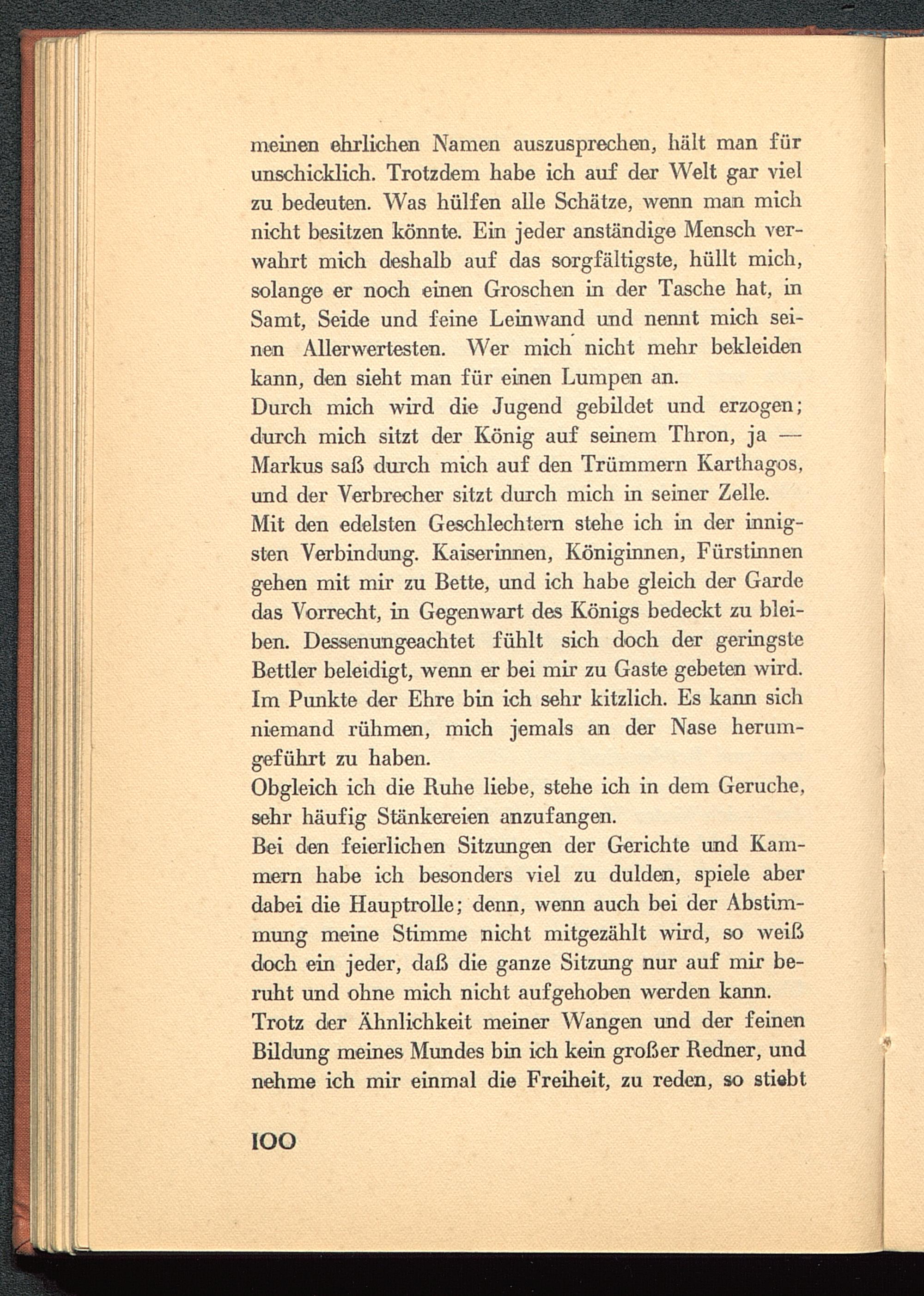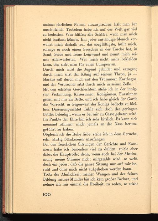 Obgleich ich die Buhe liebe, stehe ich in dem Gerüche,sehr häufig Stänkereien anzufangen.Bei den feierlichen Sitzungen der Gerichte und Kam-mern habe ich besonders viel zu dulden, spiele aberdabei die Hauptrolle; denn, wenn auch bei der Abstim-mung meine Stimme nicht mitgezählt wird, so weißdoch ein jeder, daß die ganze Sitzung nur auf mir be-ruht und ohne mich nicht aufgehoben werden kann.Trotz der Ähnlichkeit meiner Wangen und der feinenBildung meines Mundes bin ich kein großer Bedner, undnehme ich mir einmal die Freiheit, zu reden, so stiebt