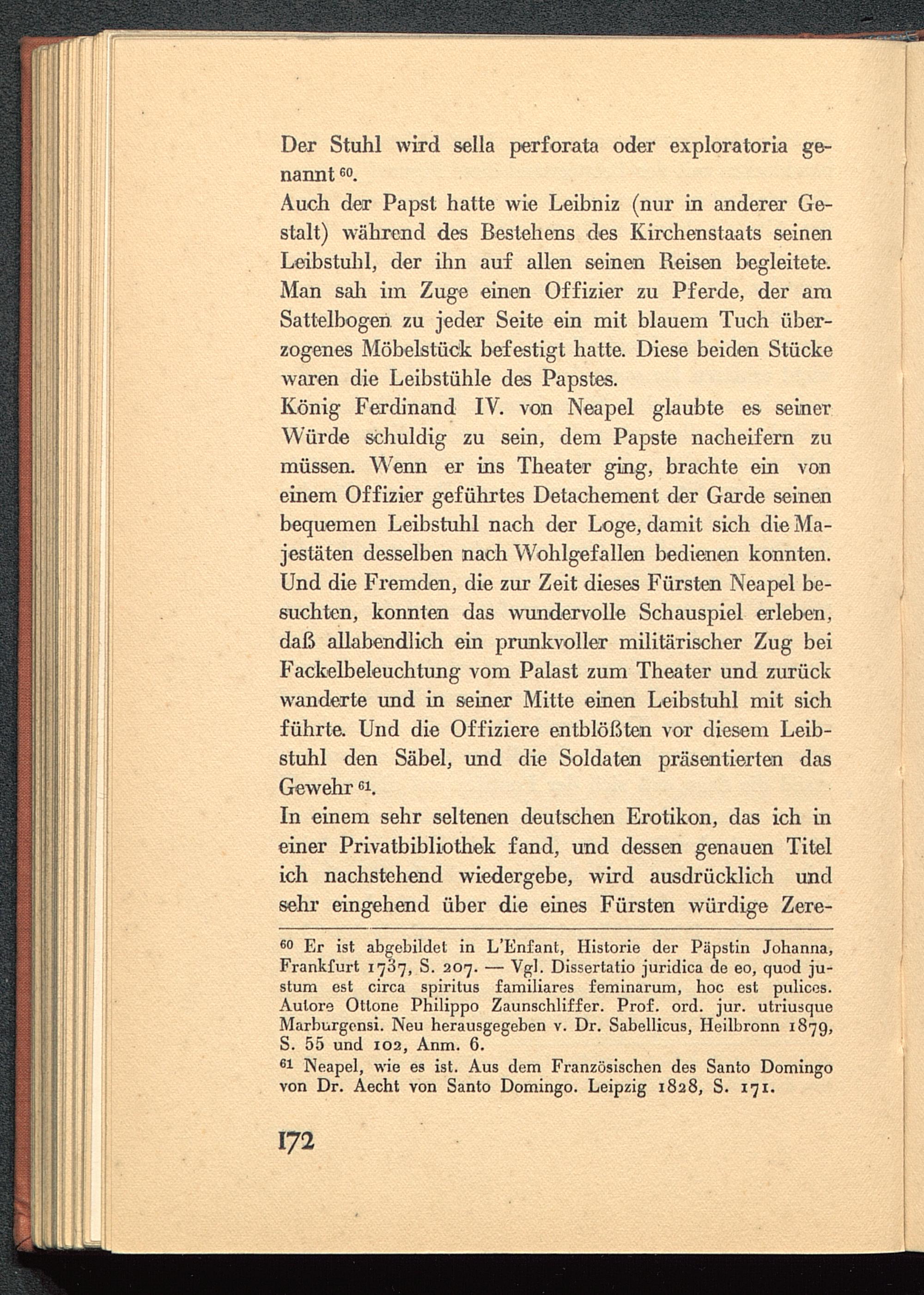 Auch der Papst hatte wie Leibniz (nur in anderer Ge-stalt) während des Bestehens des Kirchenstaats seinenLeibstuhl, der ihn auf allen seinen Reisen begleitete.Man sali im Zuge einen Offizier zu Pferde, der amSattelbogen zu jeder Seite ein mit blauem Tuch über-zogenes Möbelstück befestigt hatte. Diese beiden Stückewaren die Leibstühle des Papstes.König Ferdinand IV. von Neapel glaubte es seinerWürde schuldig zu sein, dem Papste nacheifern zumüssen. Wenn er ins Theater ging, brachte ein voneinem Offizier geführtes Detachement der Garde seinenbequemen Leibstuhl nach der Loge, damit sich die Ma-jestäten desselben nach Wohlgefallen bedienen konnten.Und die Fremden, die zur Zeit dieses Fürsten Neapel be-suchten, konnten das wundervolle Schauspiel erleben,daß allabendlich ein prunkvoller militärischer Zug beiFackelbeleuchumg vom Palast zum Theater und zurückwanderte und in seiner Mitte einen Leibstuhl mit sichführte. Und die Offiziere entblößten vor diesem Leib-stuhl den Säbel, und die Soldaten präsentierten dasGewehr «.