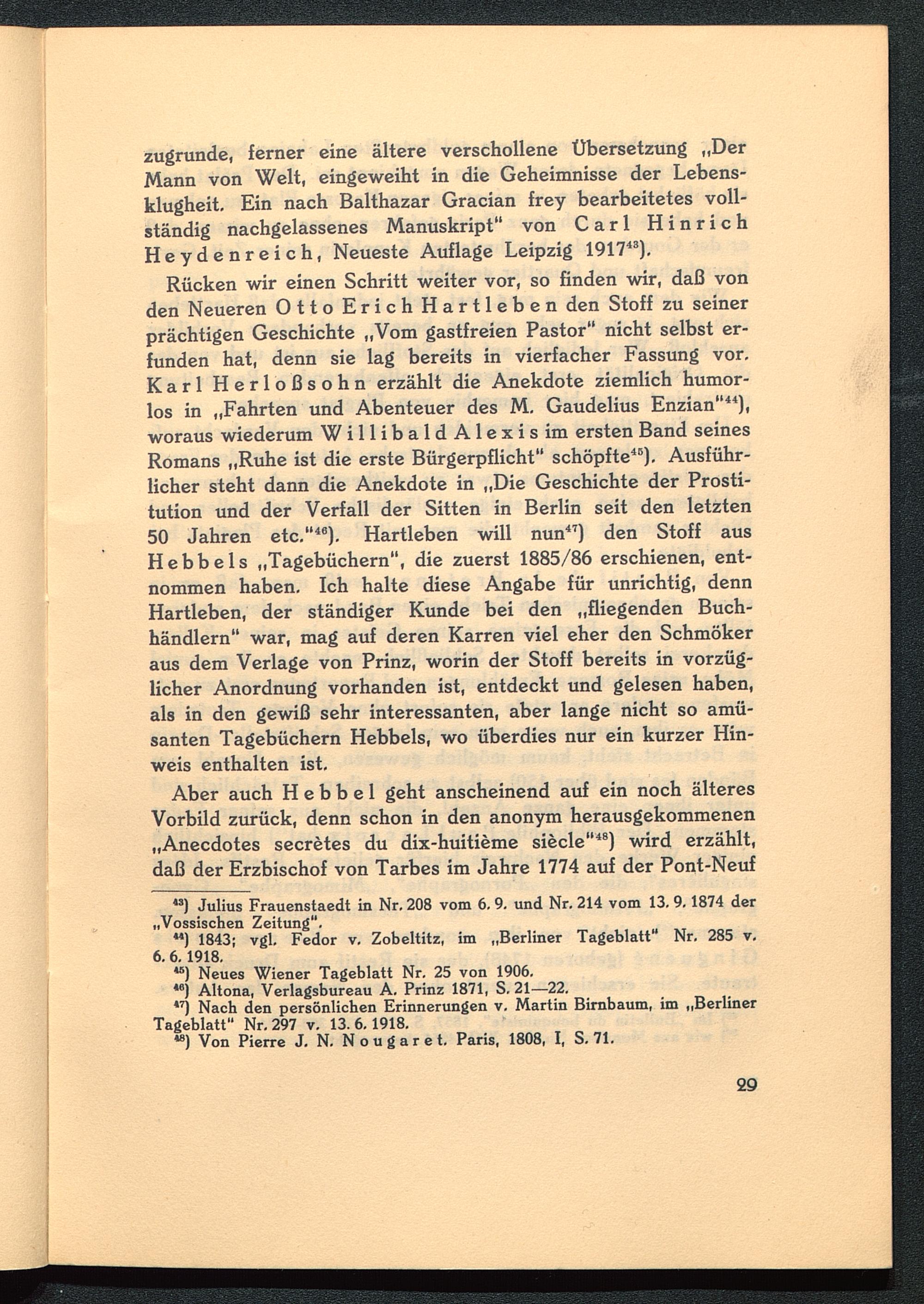 Rücken wir einen Schritt weiter vor, so finden wir, daß vonden Neueren Otto Erich Hartleben den Stoff zu seinerprächtigen Geschichte „Vom gastfreien Pastor" nicht selbst er-funden hat, denn sie lag bereits in vierfacher Fassung vor.Karl Herloßsohn erzählt die Anekdote ziemlich humor-los in „Fahrten und Abenteuer des M. Gaudelius Enzian" 44 ),woraus wiederum WillibaldAlexisim ersten Band seinesRomans „Ruhe ist die erste Bürgerpflicht" schöpfte 45 ). Ausführ-licher steht dann die Anekdote in „Die Geschichte der Prosti-tution und der Verfall der Sitten in Berlin seit den letzten50 Jahren etc." 46 ). Hartleben will nun 47 ) den Stoff ausHebbels „Tagebüchern", die zuerst 1885/86 erschienen, ent-nommen haben. Ich halte diese Angabe für unrichtig, dennHartleben , der ständiger Kunde bei den „fliegenden Buch-händlern" war, mag auf deren Karren viel eher den Schmökeraus dem Verlage von Prinz, worin der Stoff bereits in vorzüg-licher Anordnung vorhanden ist, entdeckt und gelesen haben,als in den gewiß sehr interessanten, aber lange nicht so amü-santen Tagebüchern Hebbels , wo überdies nur ein kurzer Hin-weis enthalten ist.