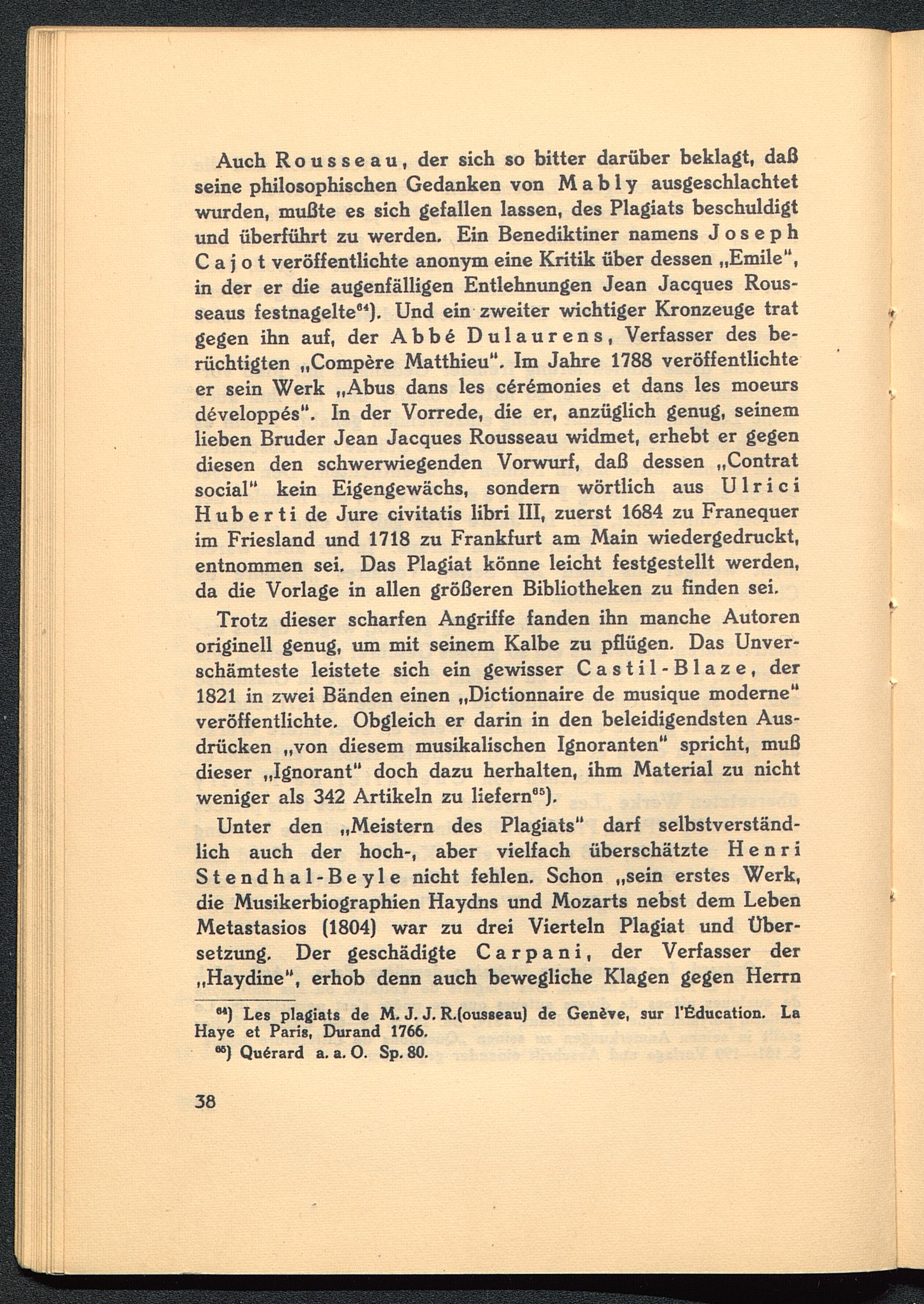 Auch Rousseau , der sich so bitter darüber beklagt, daßseine philosophischen Gedanken von M a b 1 y ausgeschlachtetwurden, mußte es sich gefallen lassen, des Plagiats beschuldigtund überführt zu werden. Ein Benediktiner namens JosephC a j o t veröffentlichte anonym eine Kritik über dessen „Emile",in der er die augenfälligen Entlehnungen Jean Jacques Rous-seaus festnagelte 84 ). Und ein zweiter wichtiger Kronzeuge tratgegen ihn auf, der Abbe Dulaurens , Verfasser des be-rüchtigten „Compere Matthieu". Im Jahre 1788 veröffentlichteer sein Werk „Abus dans les ceremonies et dans les moeursdeveloppes". In der Vorrede, die er, anzüglich genug, seinemlieben Bruder Jean Jacques Rousseau widmet, erhebt er gegendiesen den schwerwiegenden Vorwurf, daß dessen „Contratsocial " kein Eigengewächs, sondern wörtlich aus U1 r i c iH u b e r t i de Jure civitatis libri III, zuerst 1684 zu Franequerim Friesland und 1718 zu Frankfurt am Main wiedergedruckt,entnommen sei. Das Plagiat könne leicht festgestellt werden,da die Vorlage in allen größeren Bibliotheken zu finden sei.