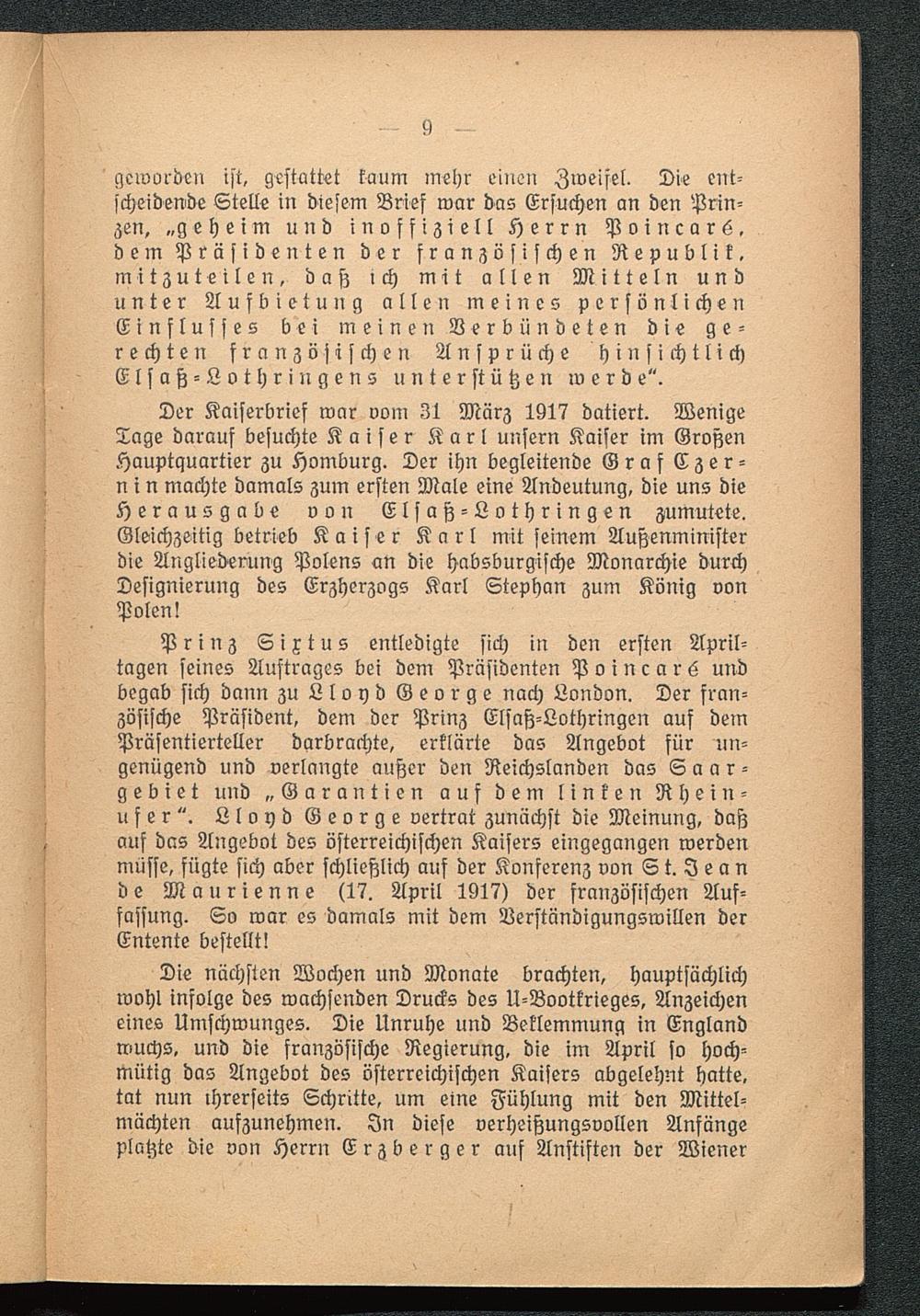 geworden ist, gestattet kaum mehr einen Zweifel. Die ent-scheidende Stelle in diesem Brief war das Ersuchen an den Prin-zen, „geheim und inoffiziell Herrn Poincarö,dem Präsidenten der französischen Republik,mitzuteilen, daß ich mit allen Mitteln undunter Aufbietung allen meines persönlichenEinflusses bei meinen Verbündeten die ge-rechten französischen Ansprüche hinsichtlichElsaß-Lothringens unterstützen werde".