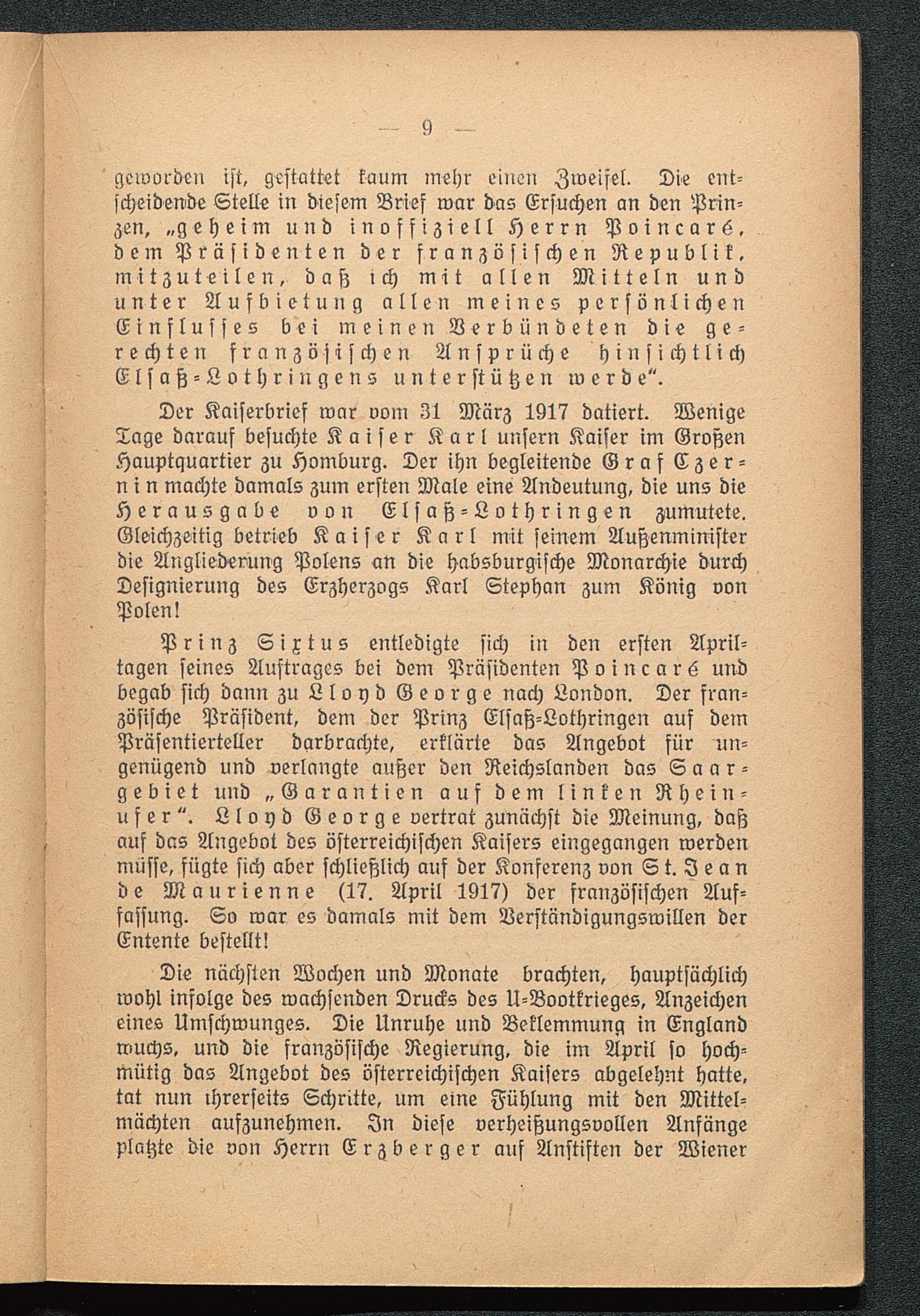 Der Kaiserbrief war vom 31 März 1917 datiert. WenigeTage darauf besuchte Kaiser Karl unsern Kaiser im GroßenHauptquartier zu Homburg . Der ihn begleitende Graf Czer -n i n machte damals zum ersten Male eine Andeutung, die uns dieHerausgabe von Elsaß-Lothringen zumutete.Gleichzeitig betrieb Kaiser Karl mit seinem Außenministerdie Angliederung Polens an die Habsburgische Monarchie durchDesignierung des Erzherzogs Karl Stephan zum König vonPolen !
