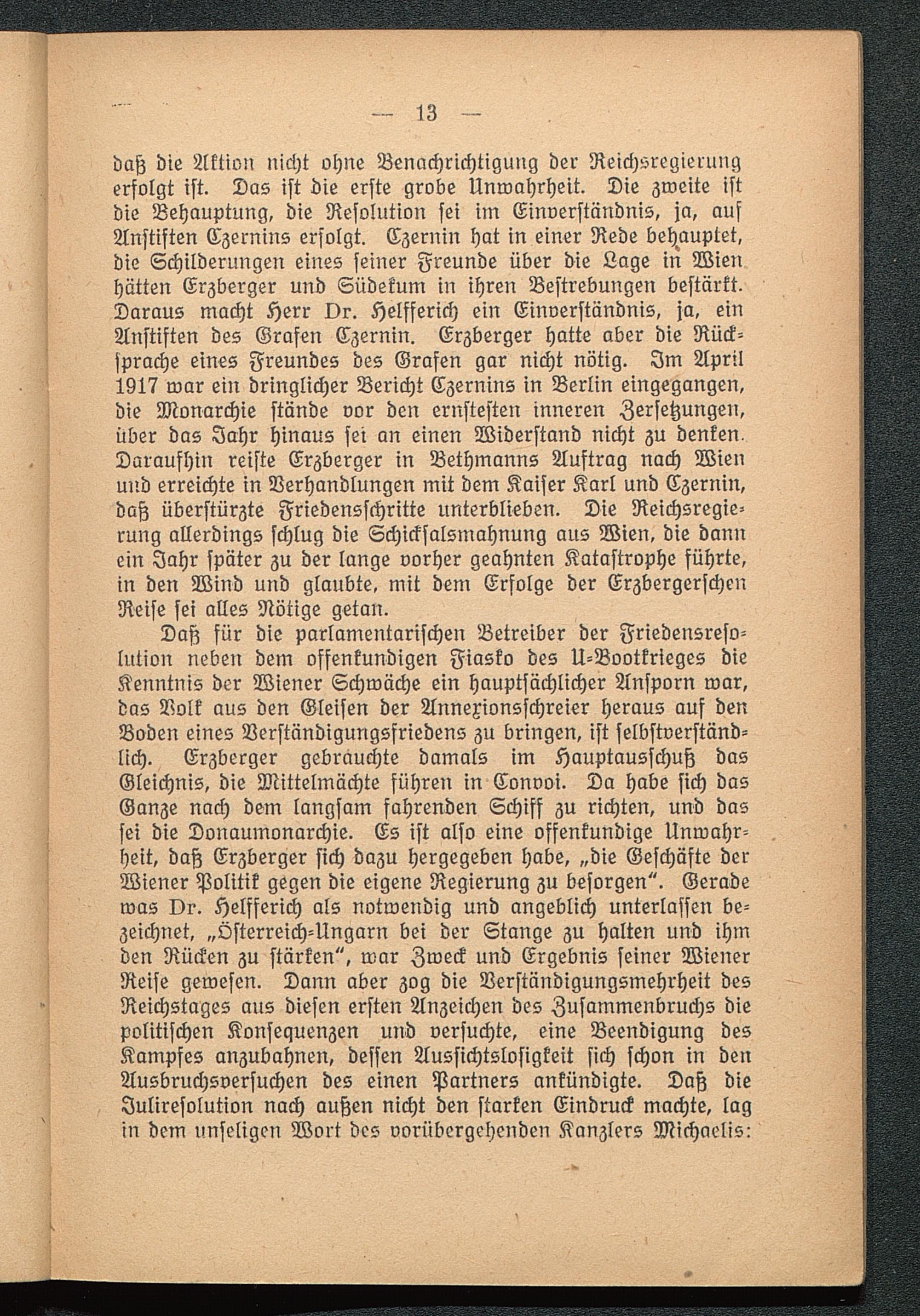 Daß für die parlamentarischen Betreiber der Friedensreso-lution neben dem offenkundigen Fiasko des U-Bootkrieges dieKenntnis der Wiener Schwäche ein hauptsächlicher Ansporn war,das Volk aus den Gleisen der Annexionsschreier heraus auf denBoden eines Verständigungsfriedens zu bringen, ist selbstverständ-lich. Erzberger gebrauchte damals im Hauptausschuß dasGleichnis, die Mittelmächte führen in Convoi. Da habe sich dasGanze nach dem langsam fahrenden Schiff zu richten, und dassei die Donaumonarchie. Es ist also eine offenkundige Unwahr-heit, daß Erzberger sich dazu hergegeben habe, „die Geschäfte derWiener Politik gegen die eigene Regierung zu besorgen". Geradewas Dr. Helfferich als notwendig und angeblich unterlassen be-zeichnet, „Österreich-Ungarn bei der Stange zu halten und ihmden Rücken zu stärken", war Zweck und Ergebnis seiner Wiener Reise gewesen. Dann aber zog die Verständigungsmehrheit desReichstages aus diesen ersten Anzeichen des Zusammenbruchs diepolitischen Konsequenzen und versuchte, eine Beendigung desKampfes anzubahnen, dessen Aussichtslosigkeit sich schon in denAusbruchsversuchen des einen Partners ankündigte. Daß dieJuliresolution nach außen nicht den starken Eindruck machte, lagin dem unseligen Wort des vorübergehenden Kanzlers Michaelis: