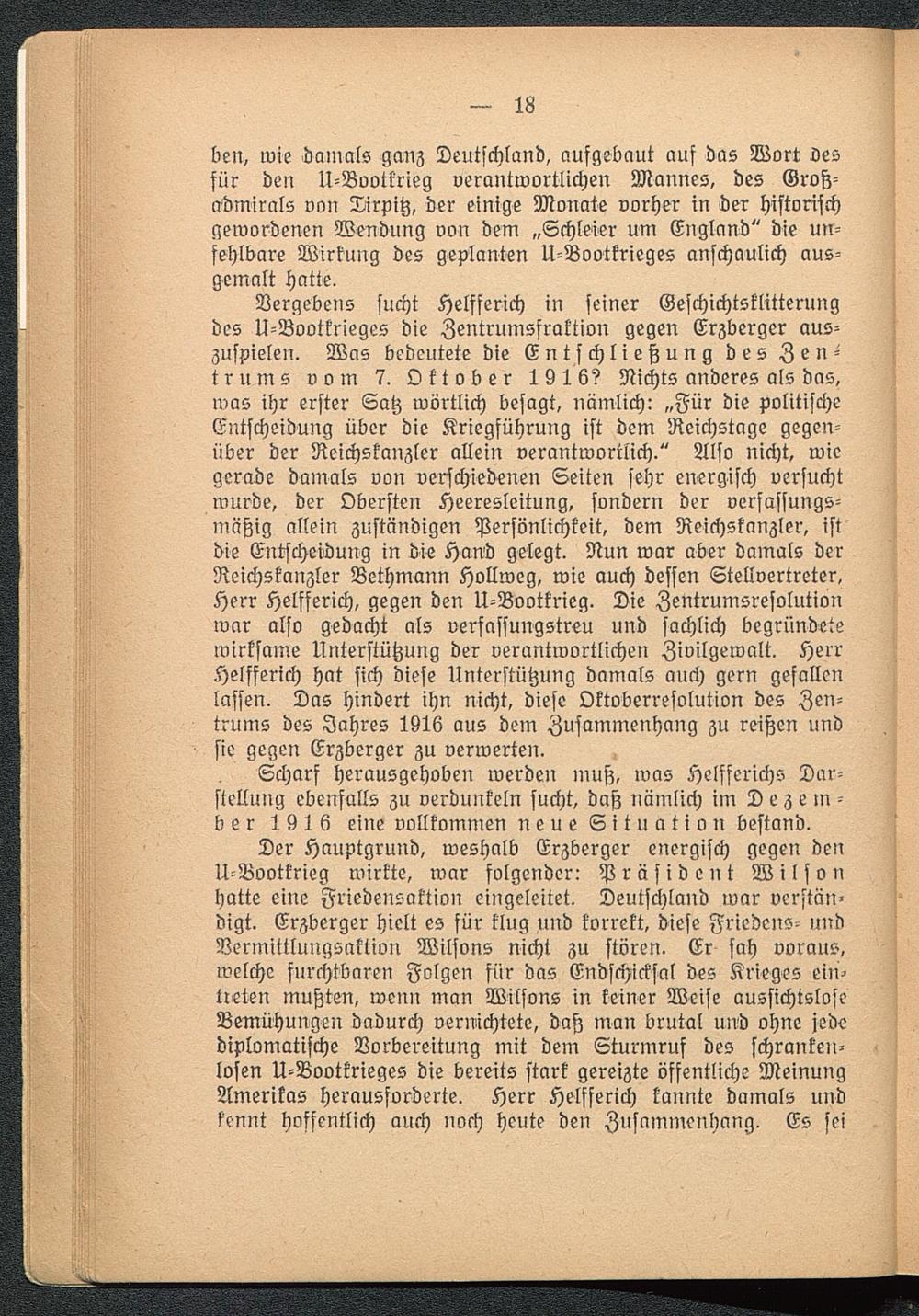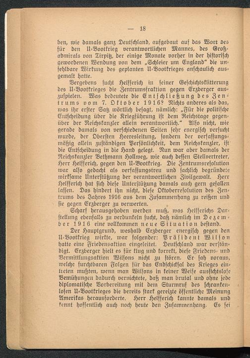 Vergebens sucht Helfferich in seiner Geschichtsklitterungdes U-Bootkrieges die Zentrumsfraktion gegen Erzberger aus-zuspielen. Was bedeutete die Entschließung des Zen-trums vom 7. Oktober 1916? Nichts anderes als das,was ihr erster Satz wörtlich besagt, nämlich: „Für die politischeEntscheidung über die Kriegführung ist dem Reichstage gegen-über der Reichskanzler allein verantwortlich." Also nicht, wiegerade damals von verschiedenen Seiten sehr energisch versuchtwurde, der Obersten Heeresleitung, sondern der verfassungs-mäßig allein zuständigen Persönlichkeit, dem Reichskanzler, istdie Entscheidung in die Hand gelegt. Nun war aber damals derReichskanzler Bethmann Hollweg, wie auch dessen Stellvertreter,Herr Helfferich, gegen den U-Bootkrieg. Die Zentrumsresolutionwar also gedacht als verfassungstreu und sachlich begründetewirksame Unterstützung der verantwortlichen Zivilgewalt. HerrHelfferich hat sich diese Unterstützung damals auch gern gefallenlassen. Das hindert ihn nicht, diese Oktoberresolution des Zen-trums des Jahres 1916 aus dem Zusammenhang zu reißen undsie gegen Erzberger zu verwerten.