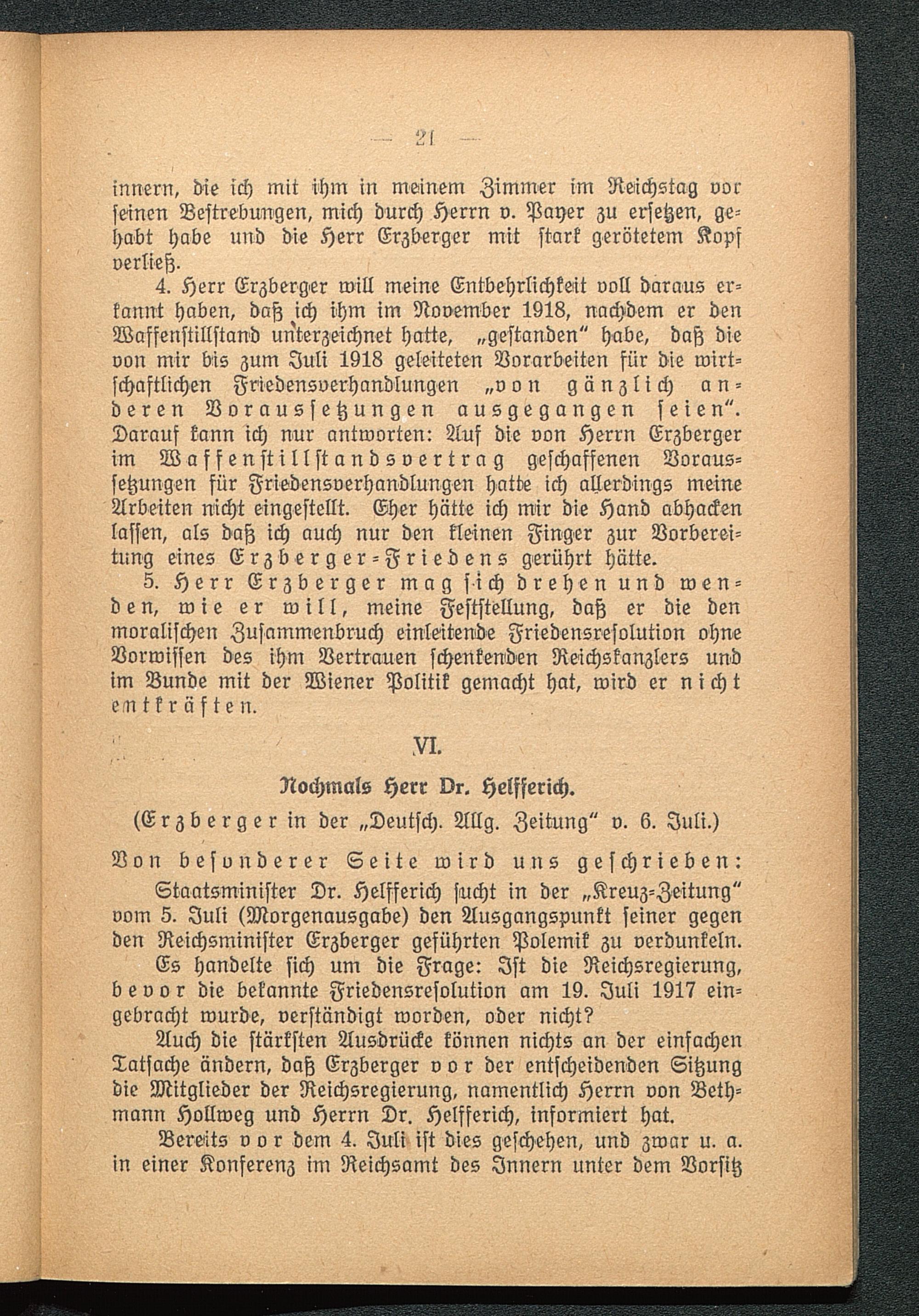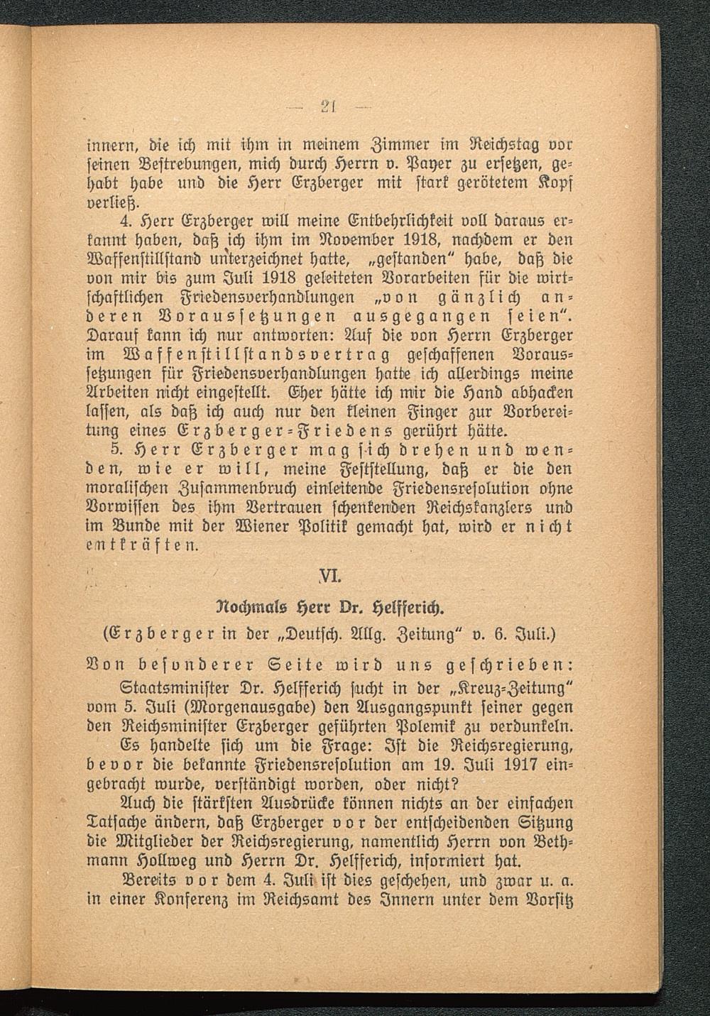 5. Herr Erzberger mag sich drehen und wen-den, wie er will, meine Feststellung, daß er die denmoralischen Zusammenbruch einleitende Friedensresolution ohneVorwissen des ihm Vertrauen schenkenden Reichskanzlers undim Bunde mit der Wiener Politik gemacht hat, wird er nichtentkräften.