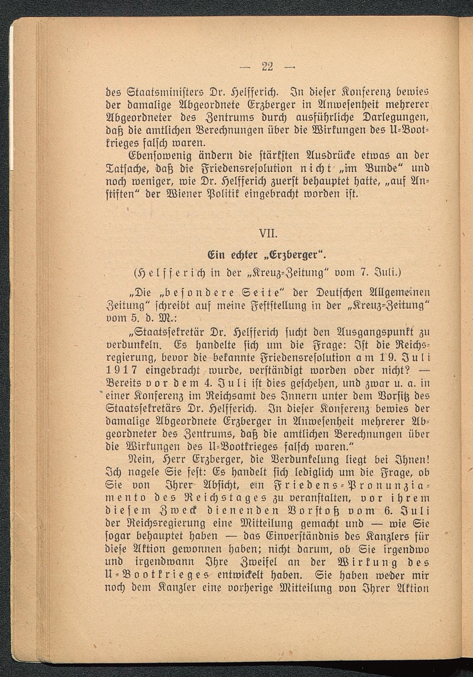 „Staatssekretär Dr. Helfferich sucht den Ausgangspunkt zuverdunkeln. Es handelte sich um die Frage: Ist die Reichs-regierung, bevor die bekannte Friedensresolution am 19. Juli1917 eingebracht wurde, verständigt worden oder nicht? —Bereits vor dem 4. Juli ist dies geschehen, und zwar u. a. ineiner Konferenz im Reichsamt des Innern unter dem Vorsitz desStaatssekretärs Dr. Helfferich. In dieser Konferenz bewies derdamalige Abgeordnete Erzberger in Anwesenheit mehrerer Ab-geordneter des Zentrums, daß die amtlichen Berechnungen überdie Wirkungen des U-Bootkrieges falsch waren."