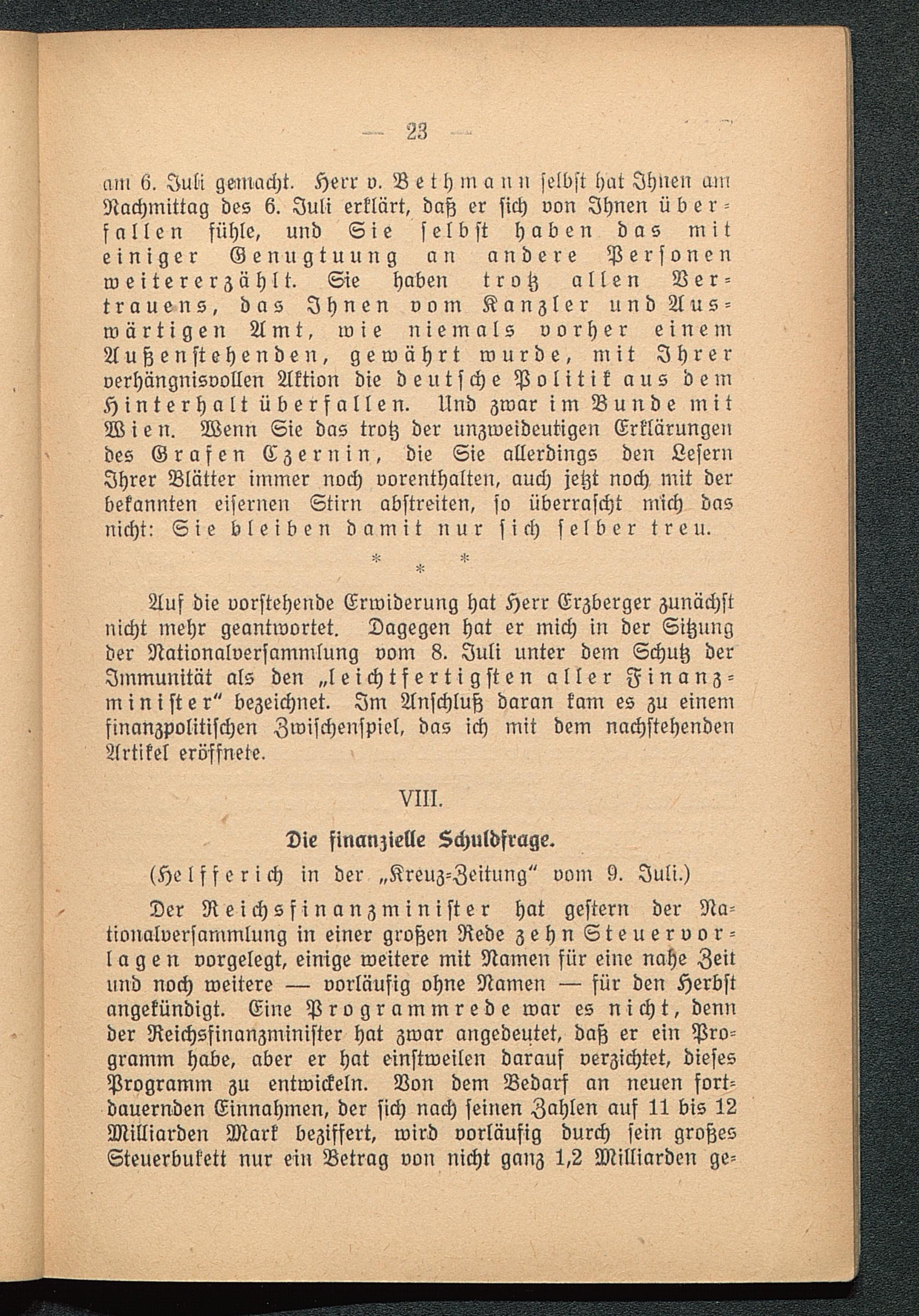 Auf die vorstehende Erwiderung hat Herr Erzberger zunächstnicht mehr geantwortet. Dagegen hat er mich in der Sitzungder Nationalversammlung vom 8. Juli unter dem Schutz derImmunität als den „leichtfertigsten aller Finanz-minister" bezeichnet. Im Anschluß daran kam es zu einemfinanzpolitischen Zwischenspiel, das ich mit dem nachstehendenArtikel eröffnete.