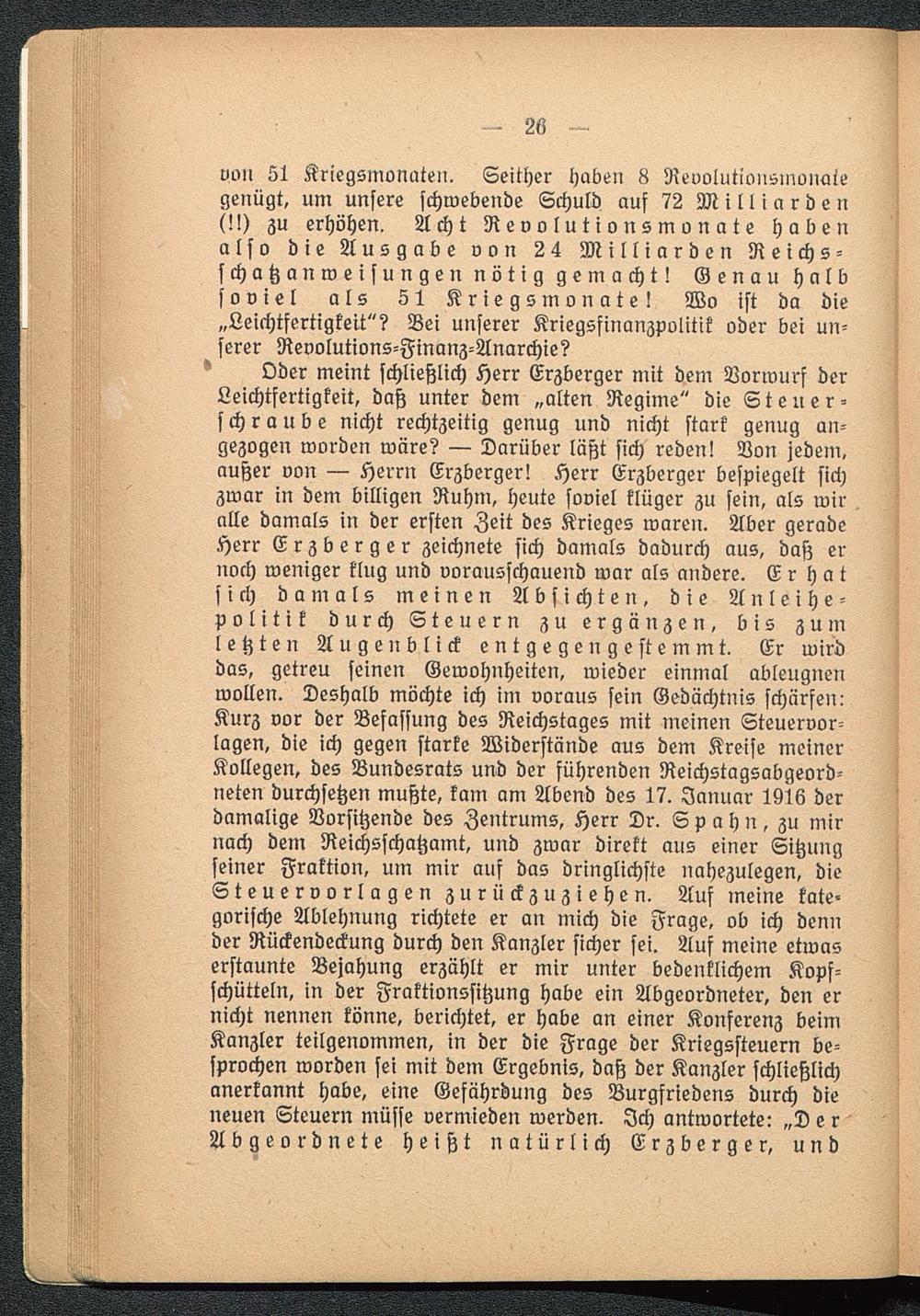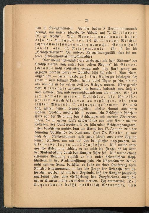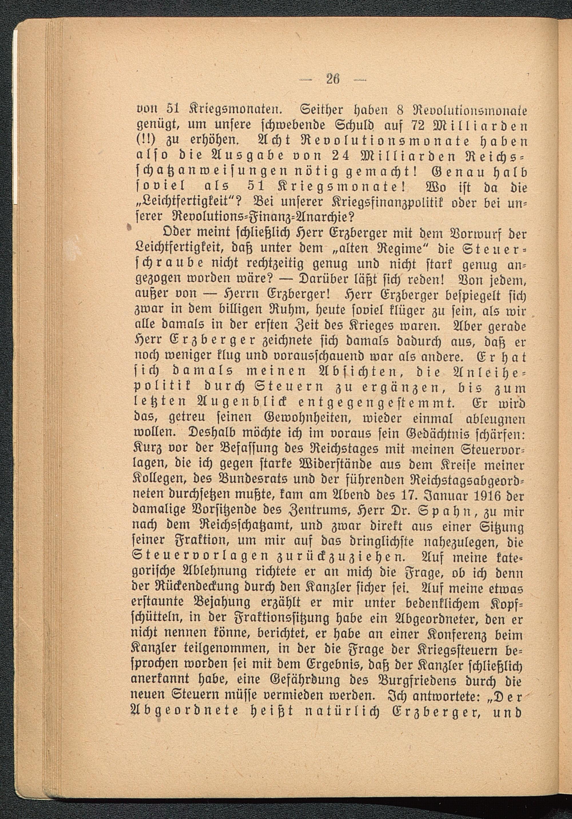 Oder meint schließlich Herr Erzberger mit dem Vorwurf derLeichtfertigkeit, daß unter dem „alten Regime" die Steuer-schraube nicht rechtzeitig genug und nicht stark genug an-gezogen worden wäre? — Darüber läßt sich reden! Von jedem,außer von — Herrn Erzberger! Herr Erzberger bespiegelt sichzwar in dem billigen Ruhm, heute soviel klüger zu sein, als wiralle damals in der ersten Zeit des Krieges waren. Aber geradeHerr Erzberger zeichnete sich damals dadurch aus, daß ernoch weniger klug und vorausschauend war als andere. Erhatsich damals meinen Absichten, die Anleihe-politik durch Steuern zu ergänzen, bis zumletzten Augenblick entgegen gestemmt. Er wirddas, getreu seinen Gewohnheiten, wieder einmal ableugnenwollen. Deshalb möchte ich im voraus sein Gedächtnis schürfen:Kurz vor der Befassung des Reichstages mit meinen Steuervor-lagen, die ich gegen starke Widerstände aus dem Kreise meinerKollegen, des Bundesrats und der führenden Reichstagsabgeord-neten durchsetzen mußte, kam am Abend des 17. Januar 1916 derdamalige Vorsitzende des Zentrums, Herr Dr. Spahn, zu mirnach dem Reichsschatzamt, und zwar direkt aus einer Sitzungseiner Fraktion, um mir ans das dringlichste nahezulegen, dieSteuervorlagen zurückzuziehen. Auf meine kate-gorische Ablehnung richtete er an mich die Frage, ob ich dennder Rückendeckung durch den Kanzler sicher sei. Auf meine etwaserstaunte Bejahung erzählt er mir unter bedenklichem Kopf-schlltteln, in der Fraktionssitzung habe ein Abgeordneter, den ernicht nennen könne, berichtet, er habe an einer Konferenz beimKanzler teilgenommen, in der die Frage der Kriegssteuern be-sprochen worden sei mit dem Ergebnis, daß der Kanzler schließlichanerkannt habe, eine Gefährdung des Burgfriedens durch dieneuen Steuern müsse vermieden werden. Ich antwortete: „D e rAbgeordnete heißt natürlich Erzberger, und
