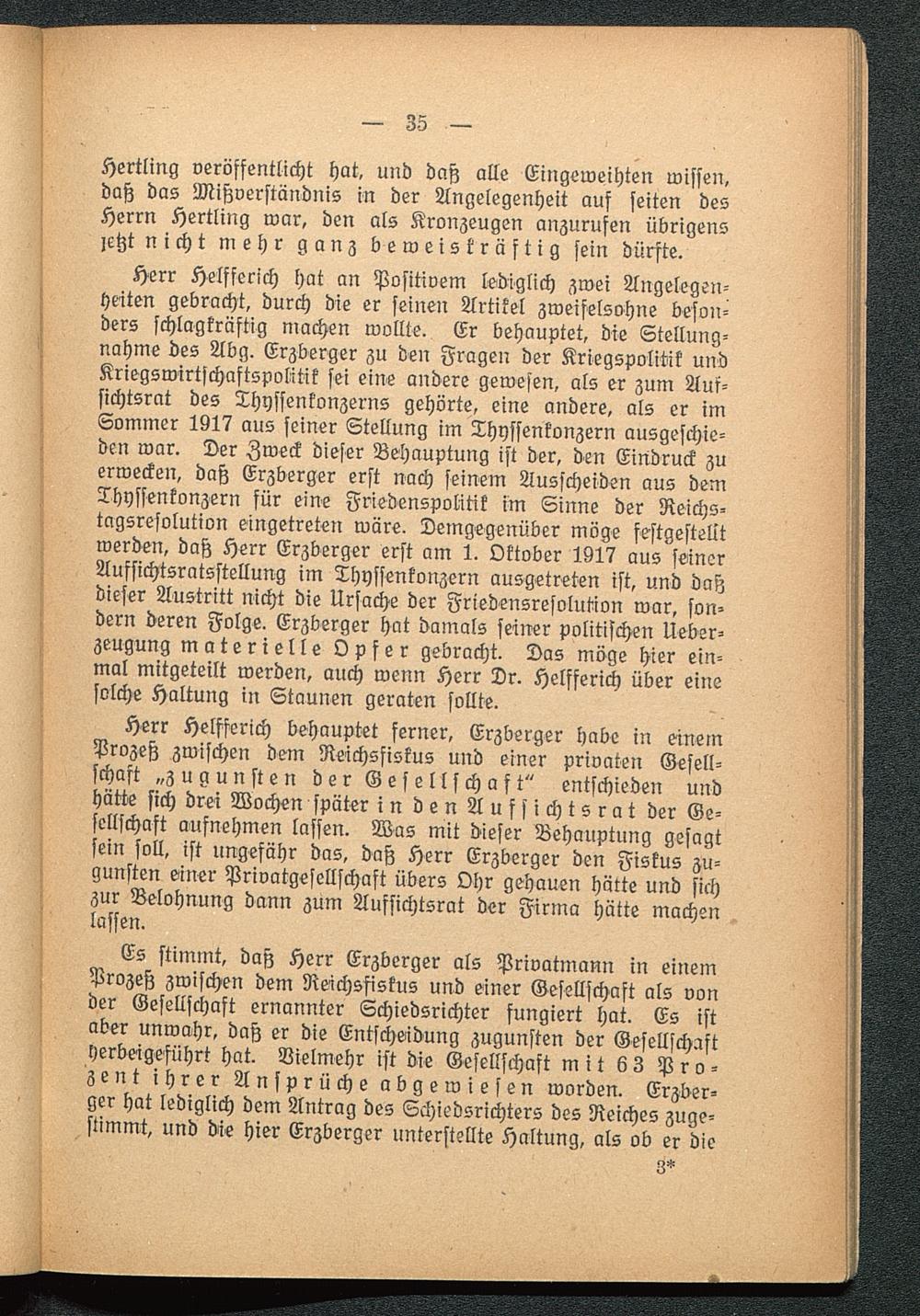 Herr Helfferich hat an Positivem lediglich zwei Angelegen-heiten gebracht, durch die er seinen Artikel zweifelsohne beson-ders schlagkräftig machen wollte. Er behauptet, die Stellung-nahme des Abg. Erzberger zu den Fragen der Kriegspolitik undKriegswirtschaftspolitik sei eine andere gewesen, als er zum Auf-sichtsrat des Thyssenkonzerns gehörte, eine andere, als er imSommer 1917 aus seiner Stellung im Thyssenkonzern ausgeschie-den war. Der Zweck dieser Behauptung ist der, den Eindruck zuerwecken, daß Erzberger erst nach seinem Ausscheiden aus demThyssenkonzern für eine Friedenspolitik im Sinne der Reichs-tagsresolution eingetreten wäre. Demgegenüber möge festgestelltwerden, daß Herr Erzberger erst am 1. Oktober 1917 aus seinerAufsichtsratsstellung im Thyssenkonzern ausgetreten ist, und daßdieser Austritt nicht die Ursache der Friedensresolution war, son-dern deren Folge. Erzberger hat damals seiner politischen Ueber-zeugung materielle Opfer gebracht. Das möge hier ein-mal mitgeteilt werden, auch wenn Herr Dr. Helfferich über einssolche Haltung in Staunen geraten sollte.