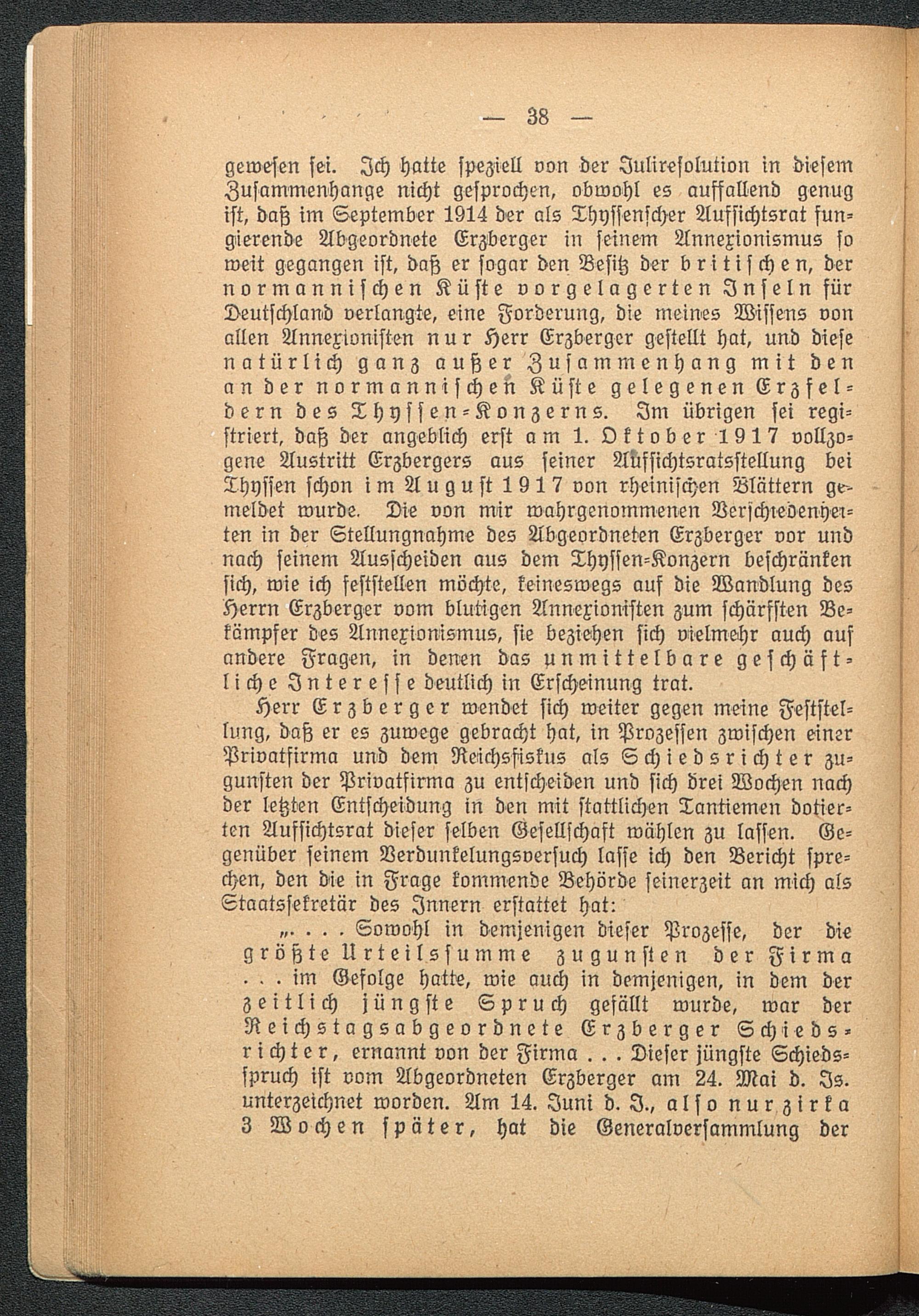 gewesen sei. Ich hatte speziell von der Juliresolution in diesemZusammenhange nicht gesprochen, obwohl es auffallend genugist, daß im September 1914 der als Thnssenscher Aussichtsrat fun-gierende Abgeordnete Erzberger in seinem Annexionismus soweit gegangen ist, daß er sogar den Besitz der britischen, dernormannischen Küste vorgelagerten Inseln fürDeutschland verlangte, eine Forderung, die meines Wissens vonallen Annexionisten nur Herr Erzberger gestellt hat, und diesenatürlich ganz außer Zusammenhang mit denan der normannischen Küste gelegenen Erzfel-dern des Thyssen-Konzerns. Im übrigen sei regi-striert, daß der angeblich erst am 1. Oktober 1917 vollzo-gene Austritt Erzbergers aus seiner Aüfsichtsratsstellung beiThyssen schon im August 1917 von rheinischen Blättern ge--meldet wurde. Die von mir wahrgenommenen VerschieoenM-ten in der Stellungnahme des Abgeordneten Erzberger vor undnach seinem Ausscheiden aus dem Thyssen-Konzern beschränkensich, wie ich feststellen möchte, keineswegs auf die Wandlung desHerrn Erzberger vom blutigen Annexionisten zum schärfsten Be-kämpfer des Annexionismus, sie beziehen sich vielmehr auch ausandere Fragen, in denen das unmittelbare geschäft-liche Interesse deutlich in Erscheinung trat.