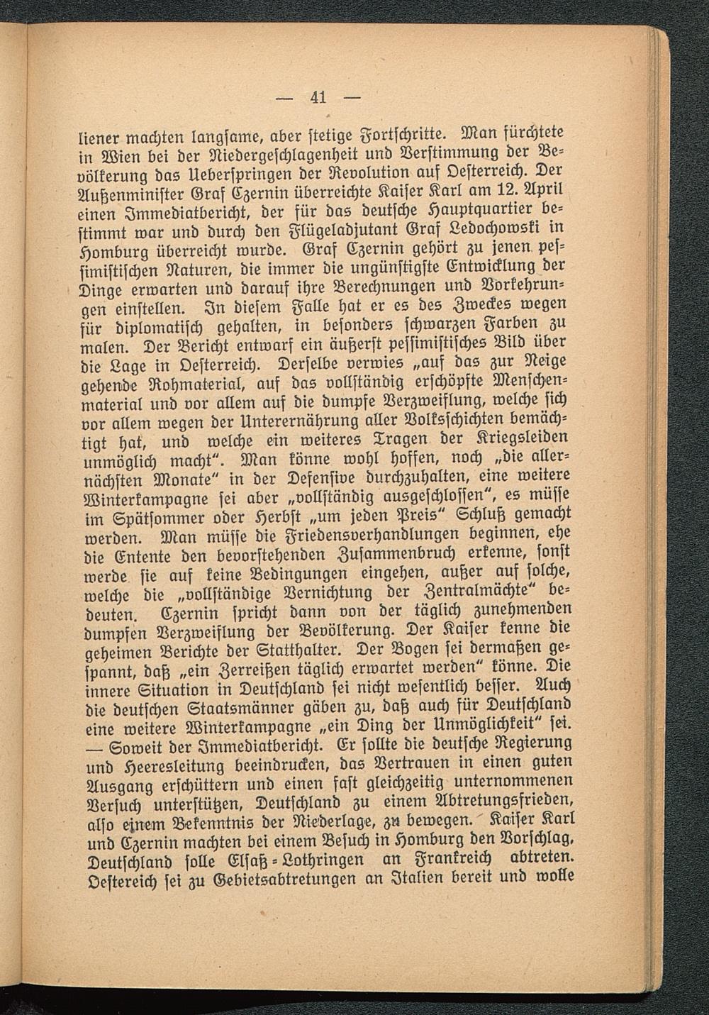liener machten langsame, aber stetige Fortschritte. Man fürchtetein Wien bei der Niedergeschlagenheit und Verstimmung der Be-völkerung das Ueberspringen der Revolution auf Oesterreich . DerAußenminister Graf Czernin überreichte Kaiser Karl am 12. Aprileinen Jmmediatbericht, der für das deutsche Hauptquartier be-stimmt war und durch den Flügeladjutant Graf Ledochorvski inHomburg überreicht wurde. Graf Czernin gehört zu jenen pes-simistischen Naturen, die immer die ungünstigste Entwicklung derDinge erwarten und darauf ihre Berechnungen und Vorkehrun-gen einstellen. In diesem Falle hat er es des Zweckes wegenfür diplomatisch gehalten, in besonders schwarzen Farben zumalen. Der Bericht entwarf ein äußerst pessimistisches Bild überdie Lage in Oesterreich . Derselbe verwies „auf das zur Neigegehende Rohmaterial, auf das vollständig erschöpfte Menschen-material und vor allem auf die dumpfe Verzweiflung, welche sichvor allem wegen der Unterernährung aller Volksschichten bemäch-tigt hat, und welche ein weiteres Tragen der Kriegsleidenunmöglich macht". Man könne wohl hoffen, noch „die aller-nächsten Monate" in der Defensive durchzuhalten, eine weitereWinterkampagne sei aber „vollständig ausgeschlossen", es müsseim Spätsommer oder Herbst „um jeden Preis" Schluß gemachtwerden. Man müsse die Friedensverhandlungen beginnen, ehedie Entente den bevorstehenden Zusammenbruch erkenne, sonstwerde sie auf keine Bedingungen eingehen, außer auf solche,welche die „vollständige Vernichtung der Zentralmächte" be-deuten. Czernin spricht dann von der täglich zunehmendendumpfen Verzweiflung der Bevölkerung. Der Kaiser kenne diegeheimen Berichte der Statthalter. Der Bogen sei dermaßen ge-spannt, daß „ein Zerreißen täglich erwartet werden" könne. Dieinnere Situation in Deutschland sei nicht wesentlich besser. Auchdie deutschen Staatsmänner gäben zu, daß auch für Deutschland eine weitere Winterkampagne „ein Ding der Unmöglichkeit" sei.— Soweit der Jmmediatbericht. Er sollte die deutsche Regierungund Heeresleitung beeindrucken, das Vertrauen in einen gutenAusgang erschüttern und einen fast gleichzeitig unternommenenVersuch unterstützen, Deutschland zu einem Abtretungsfrieden,also einem Bekenntnis der Niederlage, zu bewegen. Kaiser Karl und Czernin machten bei einem Besuch in Homburg den Vorschlag.Deutschland solle Elsaß-Lochringen an Frankreich abtreten.Oestereich sei zu Gebietsabtretungen an Italien bereit und wolle