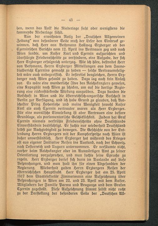 Aus der erwähnten Notiz der „Deutschen AllgemeinenZeitung" von besonderer Seite muß der Leser den Eindruck ge-winnen, daß Herr von Bethmann Hollweg Erzberger ob desCzerninschen Berichts vom 12. April ins Vertrauen zog und nachWien sandte, um Kaiser Karl und Czernin aufzurichten undüberstürzte Friedensschritte zu verhindern, eine Aufgabe, der sichHerr Erzberger erfolgreich unterzog. Wie ich höre, bestreitet Herrvon Bethmann, Herrn Erzberger Mitteilungen aus dem Imme-diatbericht Czernins gemacht zu haben — solche Vertrauensselig-keit wäre auch unbegreiflich. Er bestreitet desgleichen, Herrn Erz-berger nach Wien gesandt zu haben. Dazu lag auch kein Anlaßvor. Es wäre eine wunderliche Idee des Reichskanzlers gewesen,eine Kapazität nach Wien zu schicken, um auf die dortige Regie-rung eine rückenstärkende Wirkung auszuüben. Dazu standen dieBotschaft in Wien und die österreichisch-ungarische Botschaft inBerlin zur Verfügung, und ich habe Grund zu glauben, daß Bot-schafter Prinz Hohenlohe und meine Wenigkeit sowohl KaiserKarl als auch Czernin vertrauter waren als Herr Erzberger.Für eine moralische Einwirkung ist aber Vertrauen eine bessereGrundlage, als parlamentarische Geschicklichkeit. Zudem hat GrafCzernin niemals verfrühte Friedensschritte ohne Deutschlands Einverständnis beabsichtigt. Er suchte nur wiederholt Deutschland selbst zur Nachgiebigkeit zu bewegen. Die Geschichte von der Ent-sendung Herrn Erzbergers mit der Kampferspritze nach Wien istdaher unverständlich. Herr Erzberger hat während des Kriegesoft aus eigener Initiative Reisen ins Ausland, nach der Schweiz ,nach Oesterreich und Ungarn unternommen. Er versäumte nicht,vorher beim Reichskanzler oder im Auswärtigen Amt zu seinerOrientierung vorzusprechen, und man suchte seine Sprache zuregeln. Herr Erzberger berief sich dann im Auslande auf dieseBesprechungen, und man hielt ihn für einen Abgesandten derRegierung. Wiederholt galten Herrn Erzbergers Reisen derösterreichischen Hauptstadt. Herr Erzberger hat am 25. April1917 dem Staatssekretär Zimmermann eine Aufzeichnung überBesprechungen in Wien am 22. und 23. April mit dem Kaiser,Mitgliedern der Familie Parma und Braganza und dem GrafenCzernin zugestellt. Diese Aufzeichnung stimmt selbst nicht rechtzu der Darstellung der besonderen Seite der „Deutschen All-