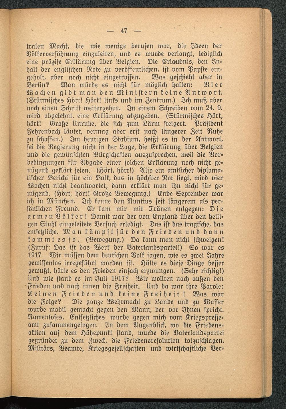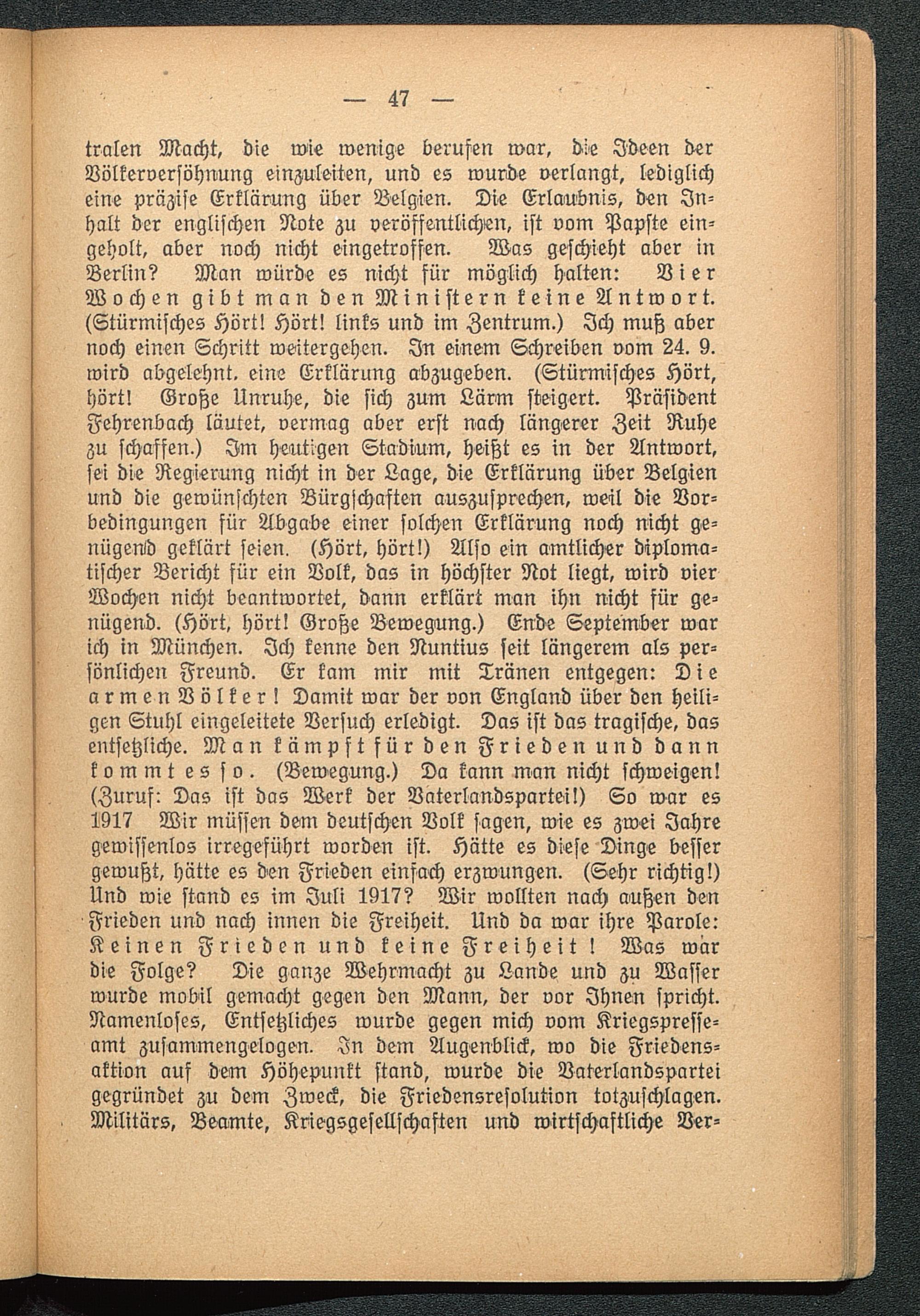 traten Macht, die wie wenige berufen war, die Ideen derVölkerversöhnung einzuleiten, und es wurde verlangt, lediglicheine präzise Erklärung über Belgien . Die Erlaubnis, den In-halt der englischen Note zu veröffentlichen, ist vom Papste ein-geholt, aber noch nicht eingetroffen. Was geschieht aber inBerlin? Man würde es nicht für möglich halten: VierWochen gibt man den Ministern keine Antwort.(Stürmisches Hört! Hört! links und im Zentrum.) Ich muß abernoch einen Schritt weitergehen. In einem Schreiben vom 24. 9.wird abgelehnt, eins Erklärung abzugeben. (Stürmisches Hört,hört! Große Unruhe, die sich zum Lärm steigert. PräsidentFehrenbach läutet, vermag aber erst nach längerer Zeit Ruhezu schaffen.) Im heutigen Stadium, heißt es in der Antwort,sei die Regierung nicht in der Lage, die Erklärung über Belgien und die gewünschten Bürgschaften auszusprechen, weil die Vor-bedingungen für Abgabe einer solchen Erklärung noch nicht ge-nügenld geklärt seien, (Hört, hört!) Also ein amtlicher diploma-tischer Bericht für ein Volk, das in höchster Not liegt, wird vierWochen nicht beantwortet, dann erklärt man ihn nicht für ge-nügend. (Hört, hört! Große Bewegung.) Ende September warich in München . Ich kenne den Nuntius seit längerem als per-sönlichen Freund. Er kam mir mit Tränen entgegen: DiearmenVölker! Damit war der von England über den heili-gen Stuhl eingeleitete Versuch erledigt. Das ist das tragische, dasentsetzliche. Man kämpft für den Frieden und dannkommt es so. (Bewegung.) Da kann man nicht schweigen!(Zuruf: Das ist das Werk der Vaterlandspartei!) So war es1917 Wir müssen dem deutschen Volk sagen, wie es zwei Jahregewissenlos irregeführt worden ist. Hätte es diese Dinge bessergewußt, hätte es den Frieden einfach erzwungen. (Sehr richtig!)Und wie stand es im Juli 1917? Wir wollten nach außen denFrieden und nach innen die Freiheit. Und da war ihre Parole:Keinen Frieden und keine Freiheit I Was wärdie Folge? Die ganze Wehrmacht zu Lande und zu Wasserwurde mobil gemacht gegen den Mann, der vor Ihnen spricht.Namenloses, Entsetzliches wurde gegen mich vom Kriegspresse-amt zusammengelogen. In dem Augenblick, wo die Friedens-aktion auf dem Höhepunkt stand, wurde die Vaterlandsparteigegründet zu dem Zweck, die Friedensresolution totzuschlagen.Militärs, Beamte, Kriegsgesellschaften und wirtschaftliche Ver-