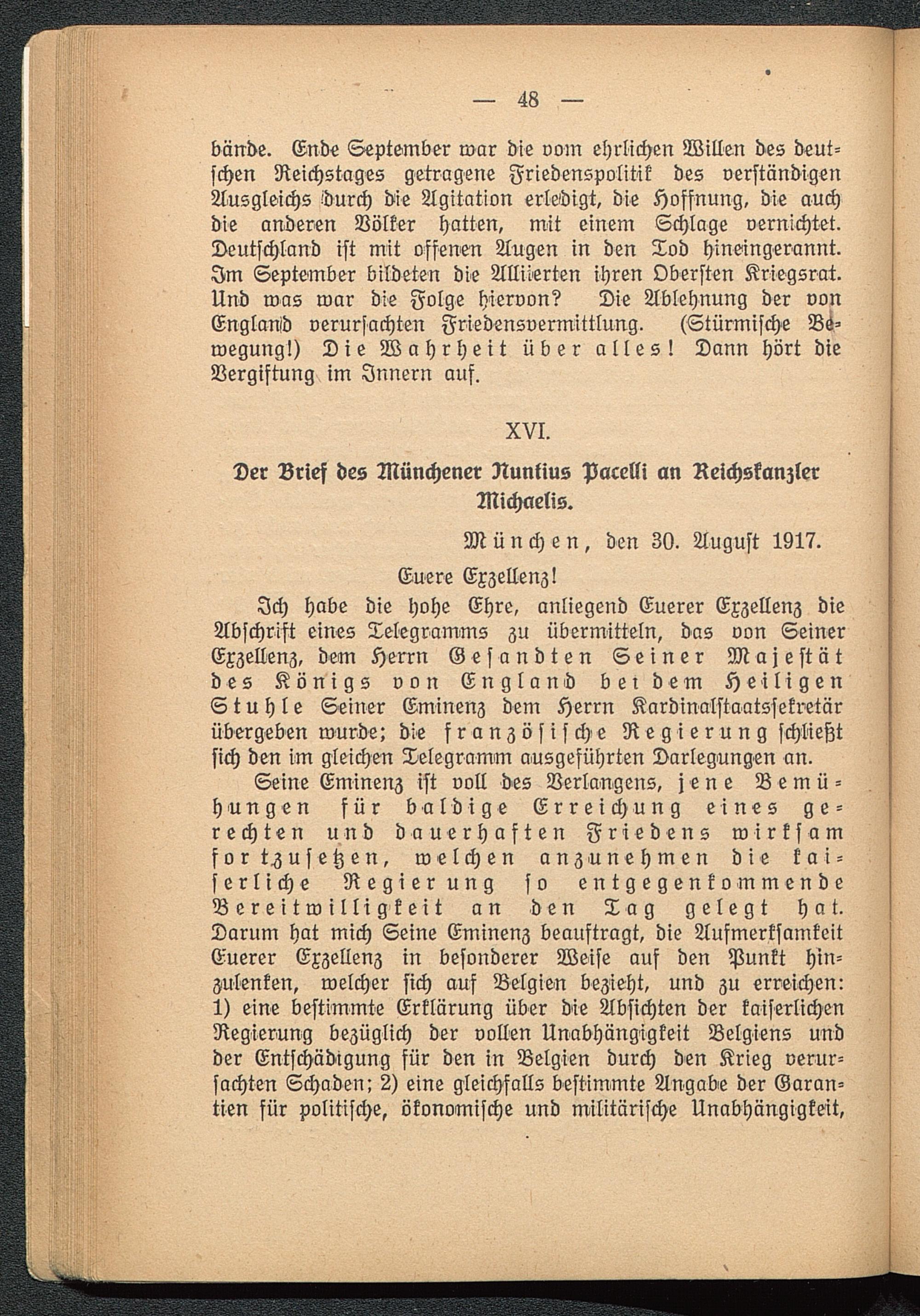 Seine Eminenz ist voll des Verlangens, jene Bemü-hungen für baldige Erreichung eines ge-rechten und dauerhaften Friedens wirksamfortzusetzen, welchen anzunehmen die kai-serliche Regierung so entgegenkommendeBereitwilligkeit an den Tag gelegt hat.Darum hat mich Seine Eminenz beauftragt, die AufmerksamkeitEuerer Exzellenz in besonderer Weise auf den Punkt hin-zulenken, welcher sich auf Belgien bezieht, und zu erreichen:1) eine bestimmte Erklärung über die Absichten der kaiserlichenRegierung bezüglich der vollen Unabhängigkeit Belgiens undder Entschädigung für den in Belgien durch den Krieg verur-sachten Schaden: 2) eine gleichfalls bestimmte Angabe der Garan-tien für politische, ökonomische und militärische Unabhängigkeit,