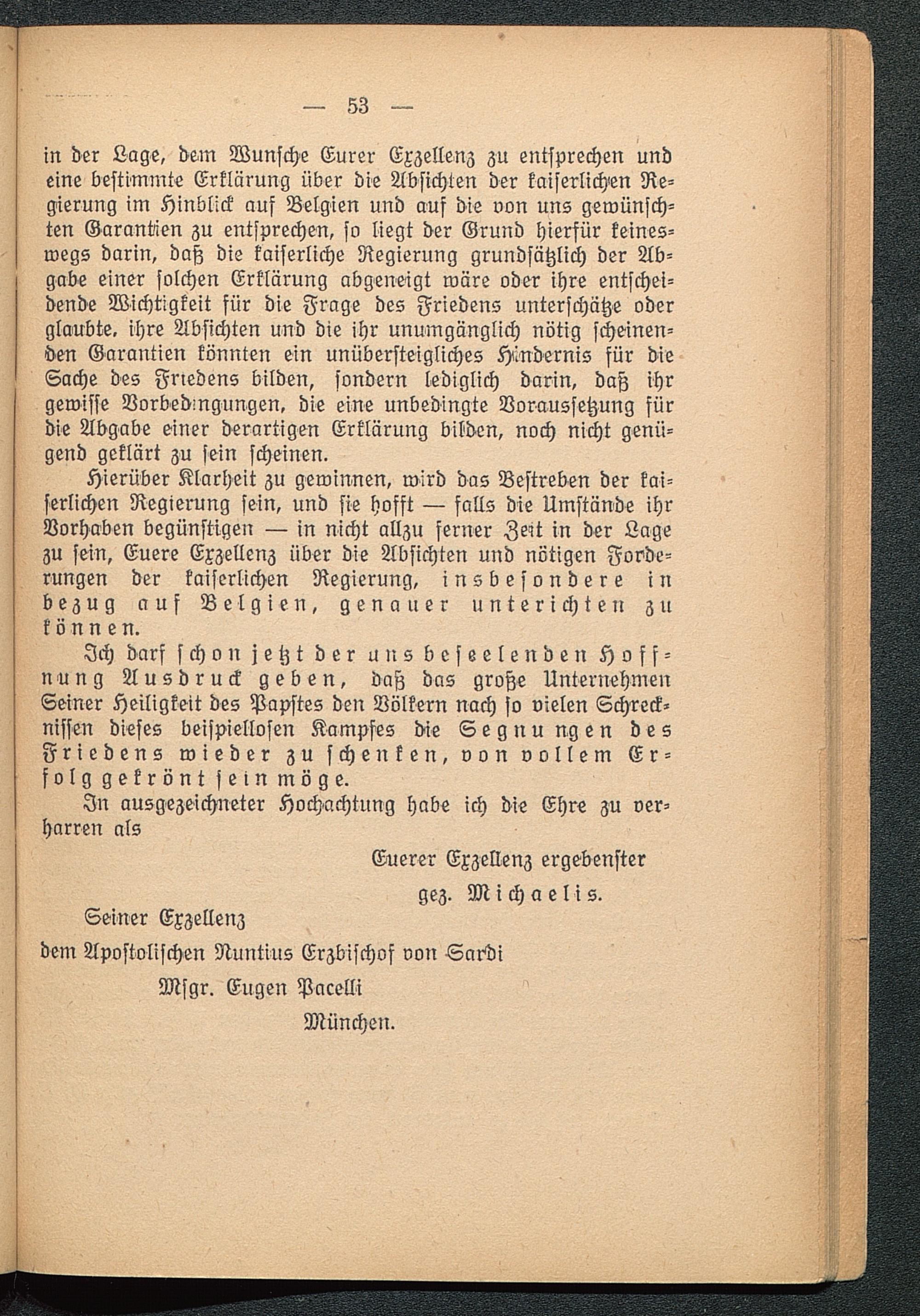 Ich darf schon jetzt der uns beseelenden Hoff-nung Ausdruck geben, daß das große UnternehmenSeiner Heiligkeit des Papstes den Völkern nach so vielen Schreck-nissen dieses beispiellosen Kampfes die Segnu ngen desFriedens wieder zu schenken, von vollem Er-folg gekrönt sein möge.
