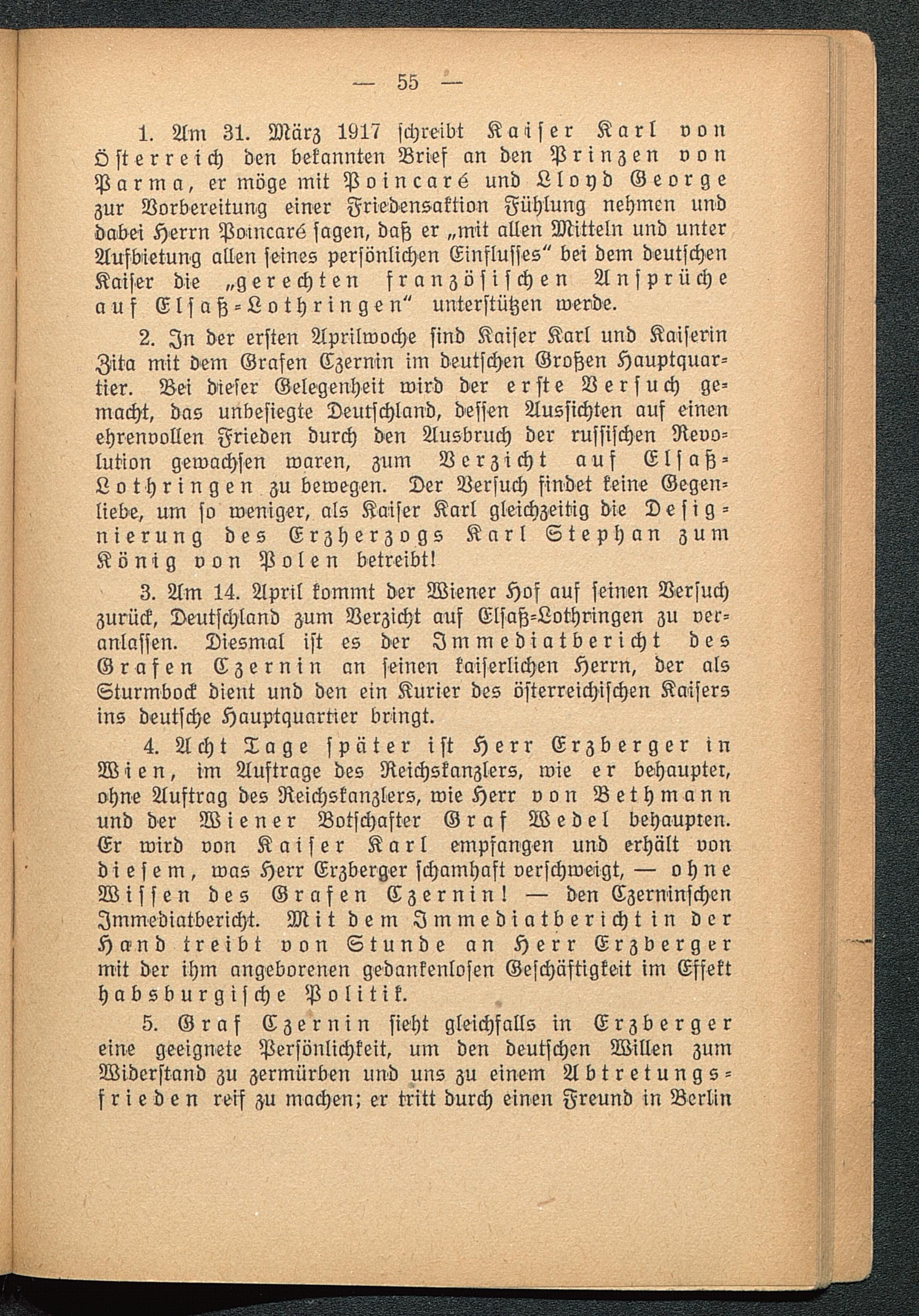 1. Am 31. März 1917 schreibt Kaiser Karl vonÖsterreich den bekannten Brief an den Prinzen vonParma, er möge mit Poincar 6 und Lloyd George zur Vorbereitung einer Friedensaktion Fühlung nehmen unddabei Herrn Pmncarö sagen, daß er „mit allen Mitteln und unterAufbietung allen seines persönlichen Einflusses" bei dem deutschenKaiser die „gerechten französischen Ansprücheauf Elsaß-Lothringen" unterstützen wevde.