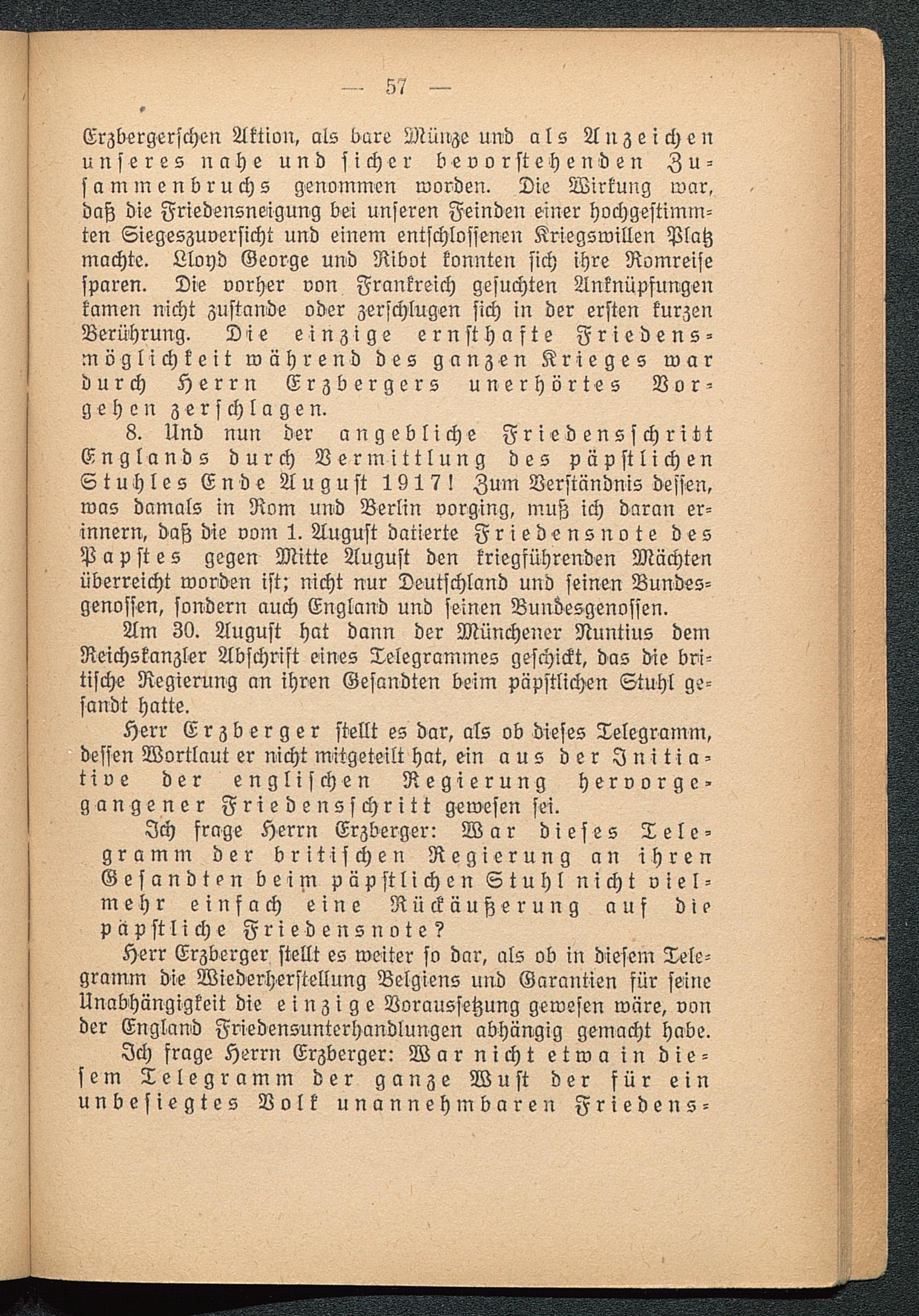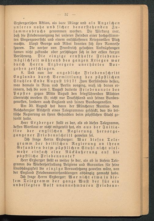 Ich frage Herrn Erzberger: War dieses Tele-gramm der britischen Regierung an ihrenGesandten beim päpstlichen Stuhl nicht viel-mehr einfach eine Rückäußerung auf diepäpstliche Friedensnote?Herr Erzberger stellt es weiter so dar, als ob in diesem Tele-gramm die Wiederherstellung Belgiens und Garantien für seineUnabhängigkeit die einzige Voraussetzung gewesen wäre, vonder England Friedensunterhandlungen abhängig gemacht habe.
