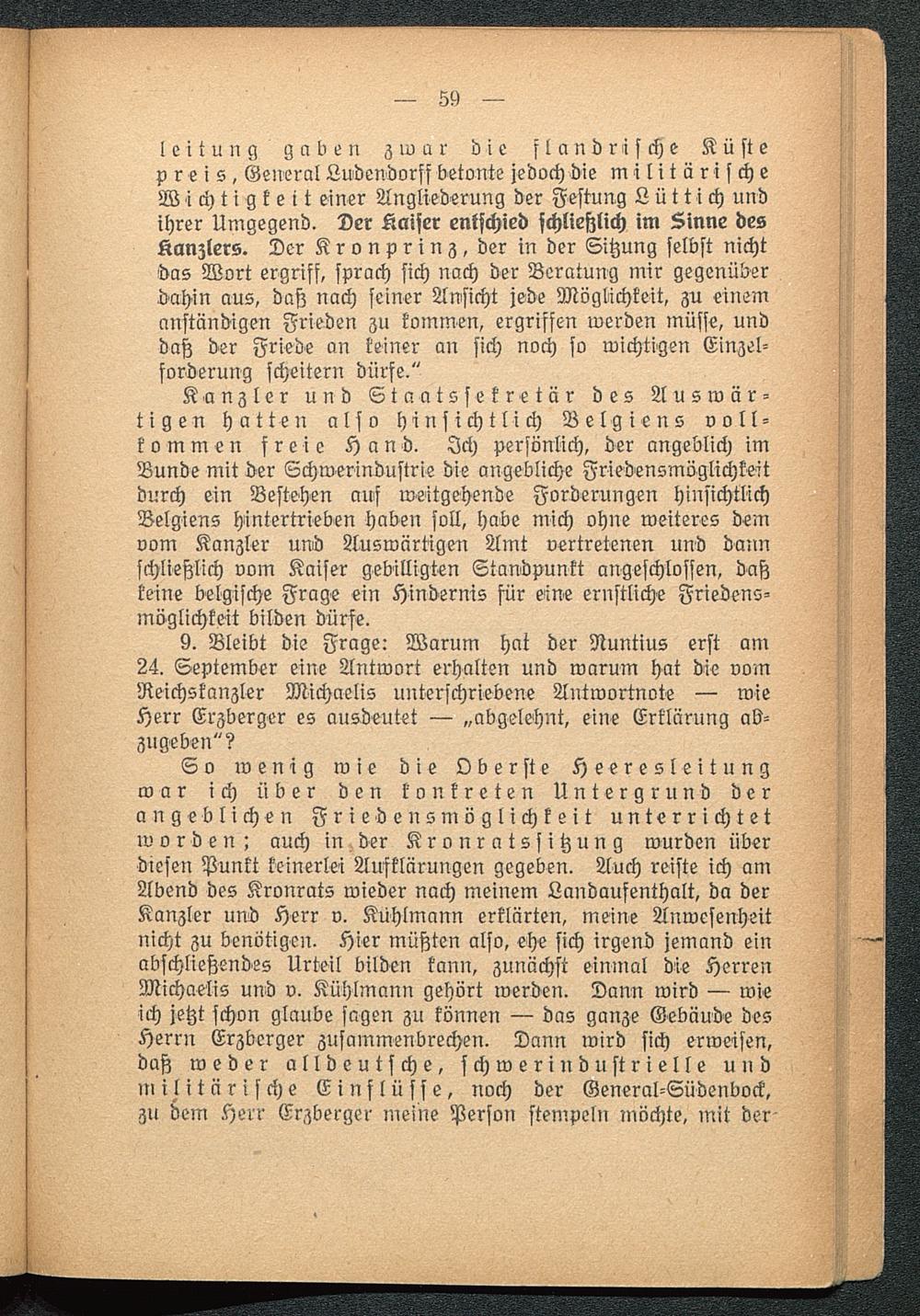 So wenig wie die Oberste Heeresleitungwar ich über den konkreten Untergrund derangeblichen Fried ensmöglichkeit unterrichtetworden; auch in der Kronratssitzung wurden überdiesen Punkt keinerlei Ausklärungen gegeben. Auch reiste ich amAbend des Kronrats wieder nach meinem Landaufenthalt, da derKanzler und Herr v. Kühlmann erklärten, meine Anwesenheitnicht zu benötigen. Hier müßten also, ehe sich irgend jemand einabschließendes Urteil bilden kann, zunächst einmal die HerrenMichaelis und v. Kllhlmann gehört werden. Dann wird — wieich jetzt schon glaube sagen zu können — das ganze Gebäude desHerrn Erzberger zusammenbrechen. Dann wird sich erweisen,daß weder alldeutsche, schwerindustrielle undmilitärische Einflüsse, noch der General-Südenbock,zu dem Herr Erzberger meine Person stempeln möchte, mit der-