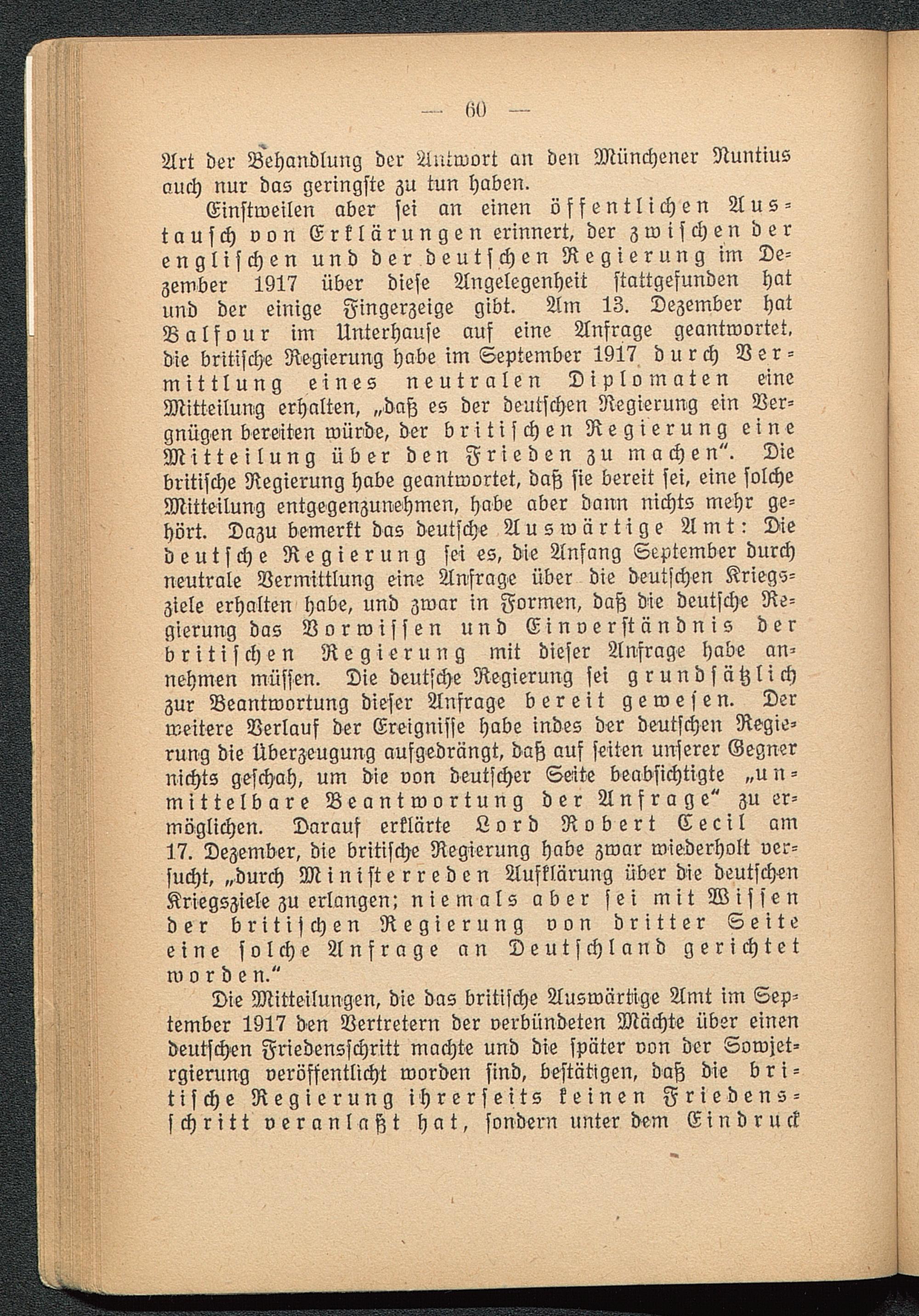 Die Mitteilungen, die das britische Auswärtige Amt im Sep-tember 1917 den Vertretern der verbündeten Mächte über einendeutschen Friedensschritt machte und die später von der Sowjet-rgierung veröffentlicht worden sind, bestätigen, daß die bri-tische Regierung ihrerseits keinen Friedens-schrittveranlnßt hat, sondern unter dem Eindruck