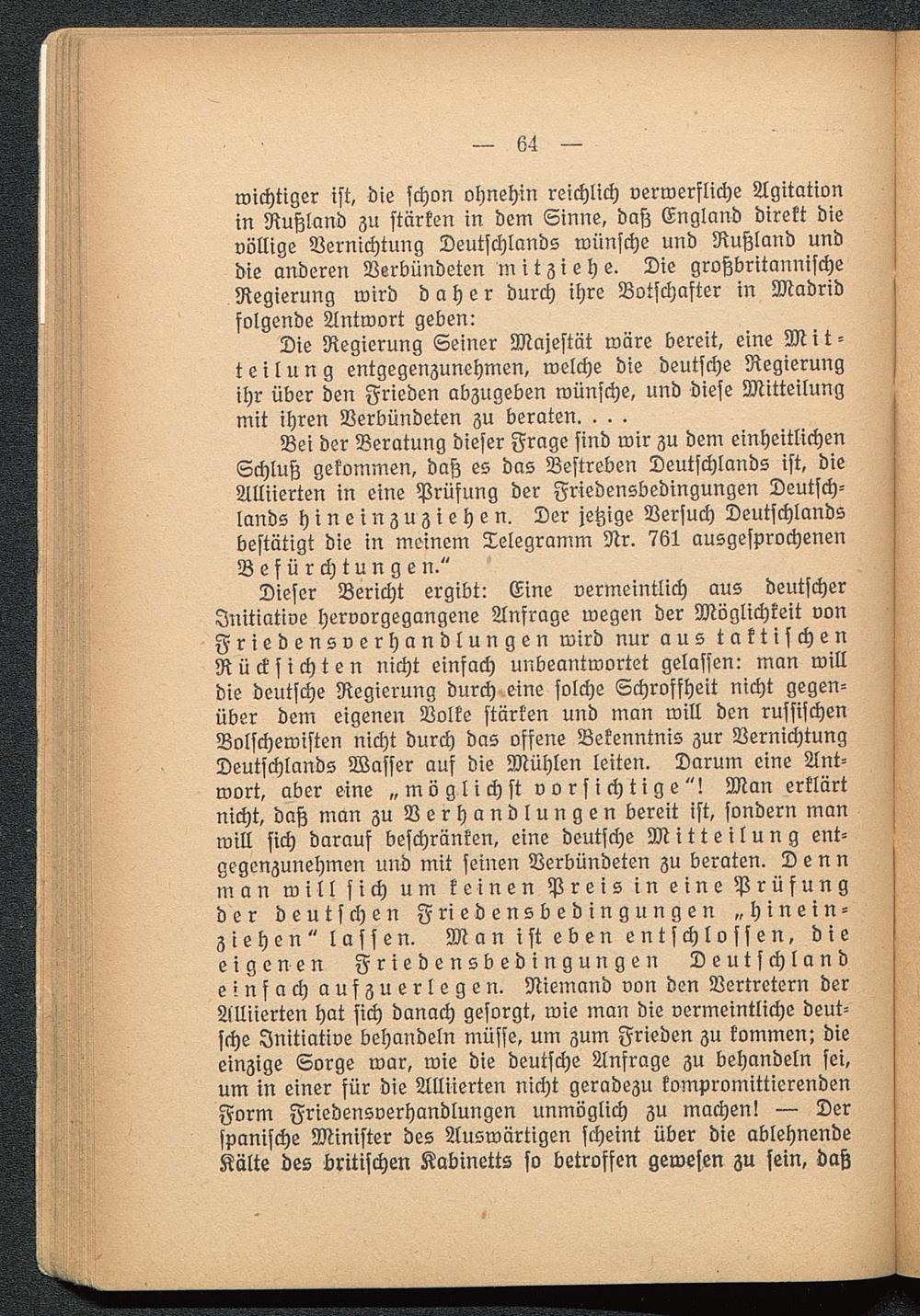 Die Regierung Seiner Majestät wäre bereit, eine Mit-teilung entgegenzunehmen, welche die deutsche Regierungihr über den Frieden abzugeben wünsche, und diese Mitteilungmit ihren Verbündeten zu beraten. . . .
