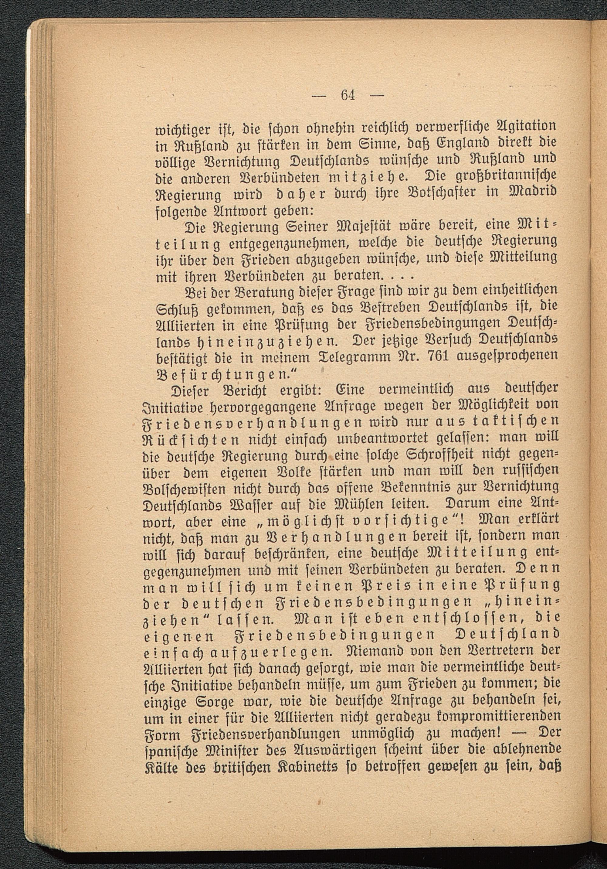 wichtiger ist, die schon ohnehin reichlich verwerfliche Agitationin Rußland zu stärken in dem Sinne, daß England direkt dievöllige Vernichtung Deutschlands wünsche und Rußland unddie anderen Verbündeten mitziehe. Die großbritannischeRegierung wird daher durch ihre Botschafter in Madrid folgende Antwort geben: