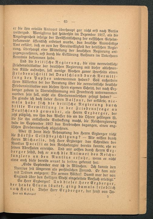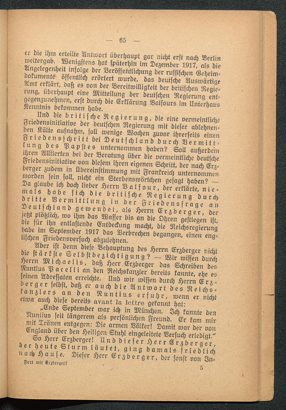 „Ende September war ich in München . Ich kannte denNuntius seit längerem als persönlichen Freund. Er kam mirmit Tränen entgegen: Die armen Völker! Damit war der vonEngland über den Heiligen Stuhl eingeleitete Versuch erledigt."So Herr Erzberger! Und dieser 5) err Erzberger,der heute Sturm läutet, ging damals friedlichnach Hause. Dieser Herr Erzberger, der sonst von Jn-