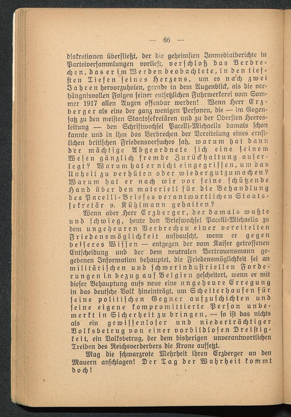 diskretionen überfließt, der bis geheimsten Jmmediatberichte inParteiversammlungen vorliest, verschloß das Verbre-chen, das er im Werden beobachtete, in den tief-sten Tiefen seines Herzens, um es nach zweiJahren hervorzuholen, gerade in dem Augenblick, als die ver-hängnisvollen Folgen seiner entsetzlichen Fuhrwerkerei vom Som-mer 1917 allen Augen offenbar werden! Wenn Herr Erz-berger als eine der ganz wenigen Personen, die — im Gegen-satz zu den meisten Staatssekretären und zu der Obersten Heeres-leitung — den Schriftwechsel Pacelli-Michaelis damals schonkannte und in ihm das Verbrechen der Vereitelung eines ernst-lichen britischen Friedensversuches sah, warum hat dannder mächtige Abgeordnete sich eine seinemWesen gänzlich fremde Zurückhaltung aufer-legt? Warum hat er nicht eingegriffen, um dasUnheil zu verhüten oder wiedergutzumachen?Warum hat er nach wie vor seine schützendeHand über den materiell für die Behandlungdes Pacelli-Briefes verantwortlichen Staats-sekretär v. Kühlmann gehalten?