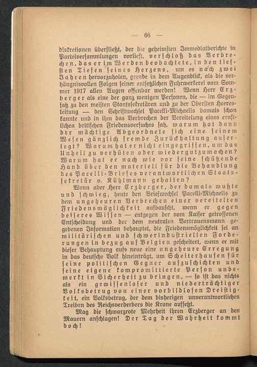 Wenn aber Herr Erzberger, der damals wußteund schwieg, heute den Briefwechsel Pacelli-Michaelis zudem ungeheuren Verbrechen einer vereiteltenFriedensmöglichkeit aufbauscht, wenn er gegenbesseres Wissen — entgegen der vom Kaiser getroffenenEntscheidung und der dem neutralen Vertrauensmann ge-gebenen Information behauptet, die Friedensmöglichkeit sei anmilitärischen und schwerindustriellen Forde-rungen in bezug auf Belgien gescheitert, wenn er mitdieser Behauptung aufs neue eine ungeheure Erregungin das deutsche Volk hineinträgt, um Scheiterhaufen fürseine politischen Gegner aufzuschichten undseine eigene kompromittierte Person unbe-merkt in Sicherheitzu bringen, — so ist das nichtsals ein gewissenloser und niederträchtigerVolksbetrug von einer vorbildlosen Dreistig-keit, ein Volksbetrug, der dem bisherigen unverantwortlichenTreiben des Reichsverderbers die Krone aufsetzt.