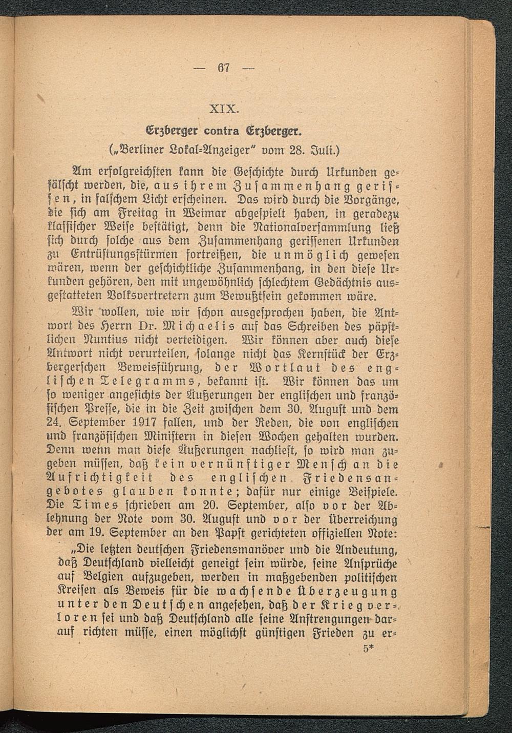 Wir wollen, wie wir schon ausgesprochen haben, die Ant-wort des Herrn Dr. Michaelis auf das Schreiben des päpst-lichen Nuntius nicht verteidigen. Wir können aber auch dieseAntwort nicht verurteilen, solange nicht das Kernstück der Erz-bergerschen Beweisführung, der Wortlaut des eng-lischen Telegramms, bekannt ist. Wir können das umso weniger angesichts der Äußerungen der englischen und franzö-sischen Presse, die in die Zeit zwischen dem 30. August und dem24. September 1917 fallen, und der Reden, die von englischenund französischen Ministern in diesen Wochen gehalten wurden.Denn wenn man diese Äußerungen nachliest, so wird man zu-geben müssen, daß kein vernünftiger Mensch an dieAufrichtigkeit des englischen Friedensan-gebotes glauben konnte; dafür nur einige Beispiele.Die Times schrieben am 20. September, also vor der Ab-lehnung der Note vom 30. August und vor der Überreichungder am 19. September an den Papst gerichteten offiziellen Note:„Die letzten deutschen Friedensmanöver und die Andeutung,daß Deutschland vielleicht geneigt sein würde, seine Ansprücheauf Belgien aufzugeben, werden in maßgebenden politischenKreisen als Beweis für die wachsende Überzeugungunter den Deutschen angesehen, daß d e r K r i e g v s r -,lorensei und daß Deutschland alle seine Anstrengungen dar-auf richten müsse, einen möglichst günstigen Frieden zu er-
