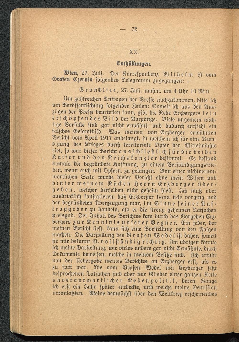 Um zahlreichen Anfragen der Presse nachzukommen, bitte ichum Veröffentlichung folgender Zeilen: Soweit ich aus den Aus-zügen der Presse beurteilen kann, gibt die Rede Erzbergers keinerschöpfendes Bild der Vorgänge. Viele ungemein wich-tige Vorfälle sind gar nicht erwähnt, und dadurch entsteht einfalsches Gesamtbild. Was meinen von Erzberger erwähntenBericht vom April 1917 anbelangt, in welchem ich für eine Been-digung des Krieges durch territoriale Opfer der Mittelmächteriet, so war dieser Bericht ausschließlichfürt» ie beidenKaiser und den Reichskanzler bestimmt. Es bestanddamals d!e begründete Hoffnung, zu einem Verständigungsfrie-dm, wenn auch mit Opfern, zu gelangen. Von einer nichtverant-wortlichen Seite wurde dieser Bericht ohne mein Wissen undhinter meinem Rücken Herrn Erzberger über-geben, welcher denselben nicht geheim hielt. Ich muß aberausdrücklich konstatieren, daß Erzberger don« ticie vorging undder begründeten Überzeugung war, im Sinne sein erAuf-traggeber zu handeln, als er die streng geheimen Tatsachenpreisgab. Der Inhalt des Berichtes kam durch das Vorgehen Erz-bergers zur Kenntnis unserer Gegner. Ein jeder, dermeinen Bericht liest, kann sich eine Vorstellung von den Folgenmachen. Die Darstellung des G r a f en W e d e l ist daher, soweitsie mir bekannt ist, v o l l st ä n d i g r i ch t i g. Im übrigen könnteich meine Darstellung, wie vieles andere gar nicht Erwähnte, durchDokumente beweisen, welche in meinem Besitze sind. Ich erfuhrvon der Uebergabe meines Berichtes an Erzberger erst, als eszu spät war Die vom Grafen Wsdel mit Erzberger jetztbesprochenen Tatsachen sind aber nur Glieder einer ganzen Ketteunverantwortlicher Nebenpolitik, deren Gängeich erst ein Jahr später entdeckte, und welche meine Demissionveranlaßten. Meine demnächst über den Weltkrieg erscheinendes