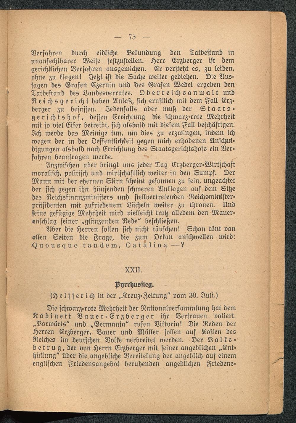 Die schwarz-rote Mehrheit der Nationalversammlung hat demKabinett Bauer-Erzberger ihr Vertrauen votiert.„Vorwärts" und „Germania" rufen Viktoria! Die Reden derHerren Erzberger, Bauer und Müller sollen auf Kosten desReiches im deutschen Volke verbreitet werden. Der Volks -betrug, der von Herrn Erzberger mit seiner angeblichen „Ent-hüllung" über die angebliche Vereitelung der angeblich auf einemenglischen Friedensangebot beruhenden angeblichen Friedens-