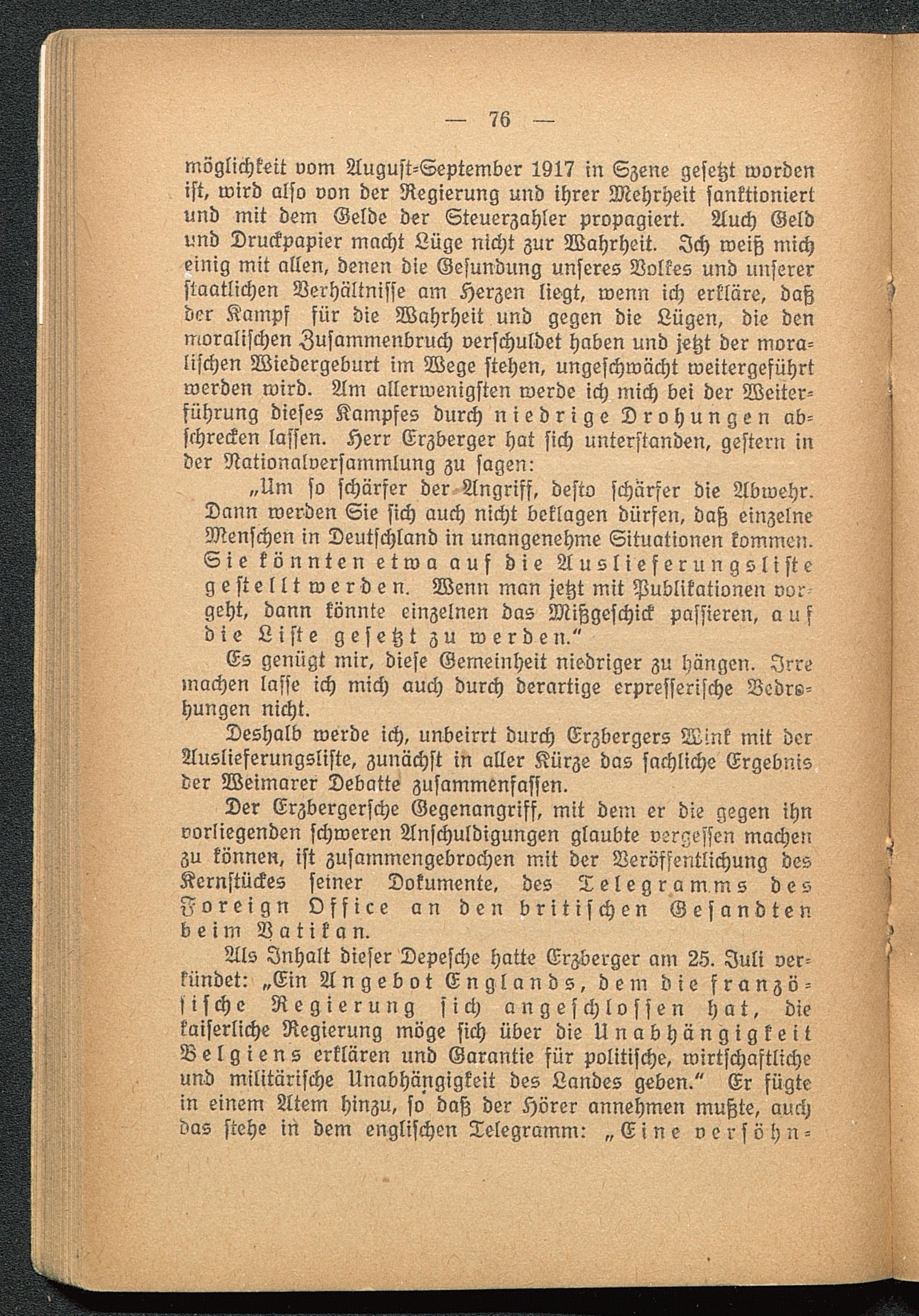 Der Erzbergersche Gegenangriff, mit dem er die gegen ihnvorliegenden schweren Anschuldigungen glaubte vergessen machenzu können, ist zusammengebrochen mit der Veröffentlichung desKernstückes seiner Dokumente, des Telegramms desForeign Office an den britischen Gesandtenbeim Vatikan .