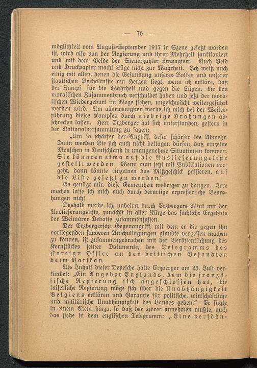 Möglichkeit vom August-September 1917 in Szene gesetzt wordenist, wird also von der Regierung und ihrer Mehrheit sanktioniertund mit dem Gelde der Steuerzahler propagiert. Auch Geldund Druckpapier macht Lüge nicht zur Wahrheit. Ich weiß micheinig mit allen, denen die Gesundung unseres Volkes und unsererstaatlichen Verhältnisse am Herzen liegt, wenn ich erkläre, daßder Kampf für die Wahrheit und gegen die Lügen, die denmoralischen Zusammenbruch verschuldet haben und jetzt der mora-lischen Wiedergeburt im Wege stehen, ungeschwächt weitergeführtwerden wird. Am allerwenigsten werde ich mich bei der Wetter-führung dieses Kampfes durch niedrige Drohungen ab-schrecken lassen. Herr Erzberger hat sich unterstanden, gestern inder Nationalversammlung zu sagen: