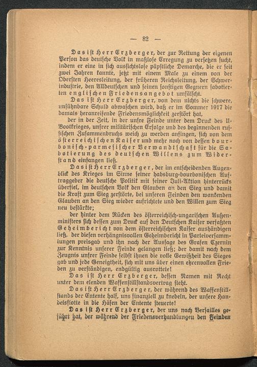 DasistHerrErzberger,derim entscheidenden Augen-blick des Krieges im Sinne seiner habsburg-bourbonischen Auf-traggeber die deutsche Politik mit seiner Juli-Aktion hinterrücksüberfiel, im deutschen Volk den Glauben an den Sieg und damitdie Kraft zum Sieg zerstörte, bei unseren Feinden den wankendenGlauben an den Sieg wieder aufrichtete und den Willen zum Siegneu bestärkte: