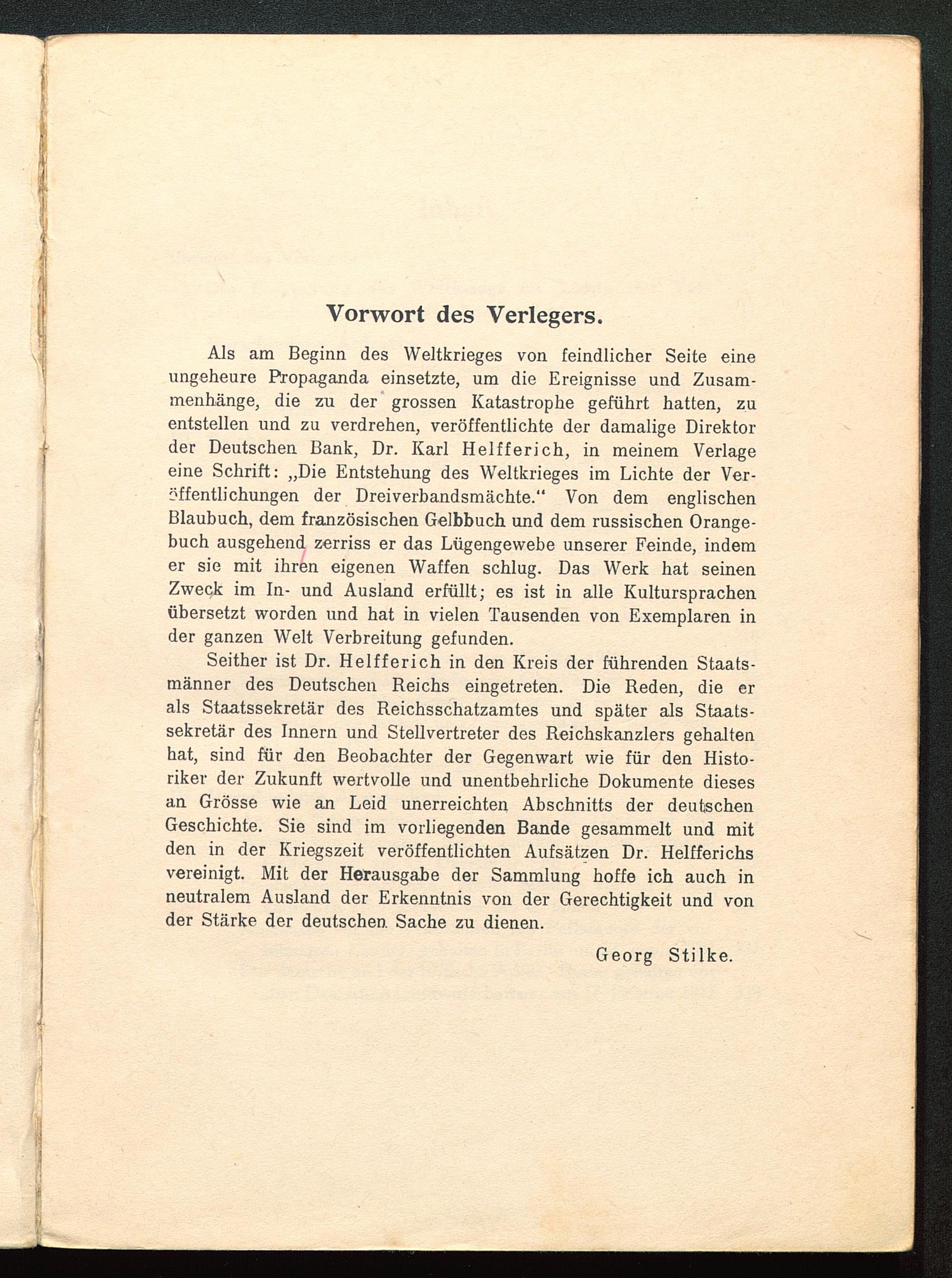 Als am Beginn des Weltkrieges von feindlicher Seite eineungeheure Propaganda einsetzte, um die Ereignisse und Zusam-menhänge, die zu der grossen Katastrophe geführt hatten, zuentstellen und zu verdrehen, veröffentlichte der damalige Direktorder Deutschen Bank, Dr. Karl Helfferich , in meinem Verlageeine Schrift: „Die Entstehung des Weltkrieges im Lichte der Ver-öffentlichungen der Dreiverbandsmächte." Von dem englischenBlaubuch, dem französischen Gelbbuch und dem russischen Orange-buch ausgehend zerriss er das Lügengewebe unserer Feinde, indemer sie mit ihren eigenen Waffen schlug. Das Werk hat seinenZweck im In- und Ausland erfüllt; es ist in alle Kultursprachenübersetzt worden und hat in vielen Tausenden von Exemplaren inder ganzen Welt Verbreitung gefunden.