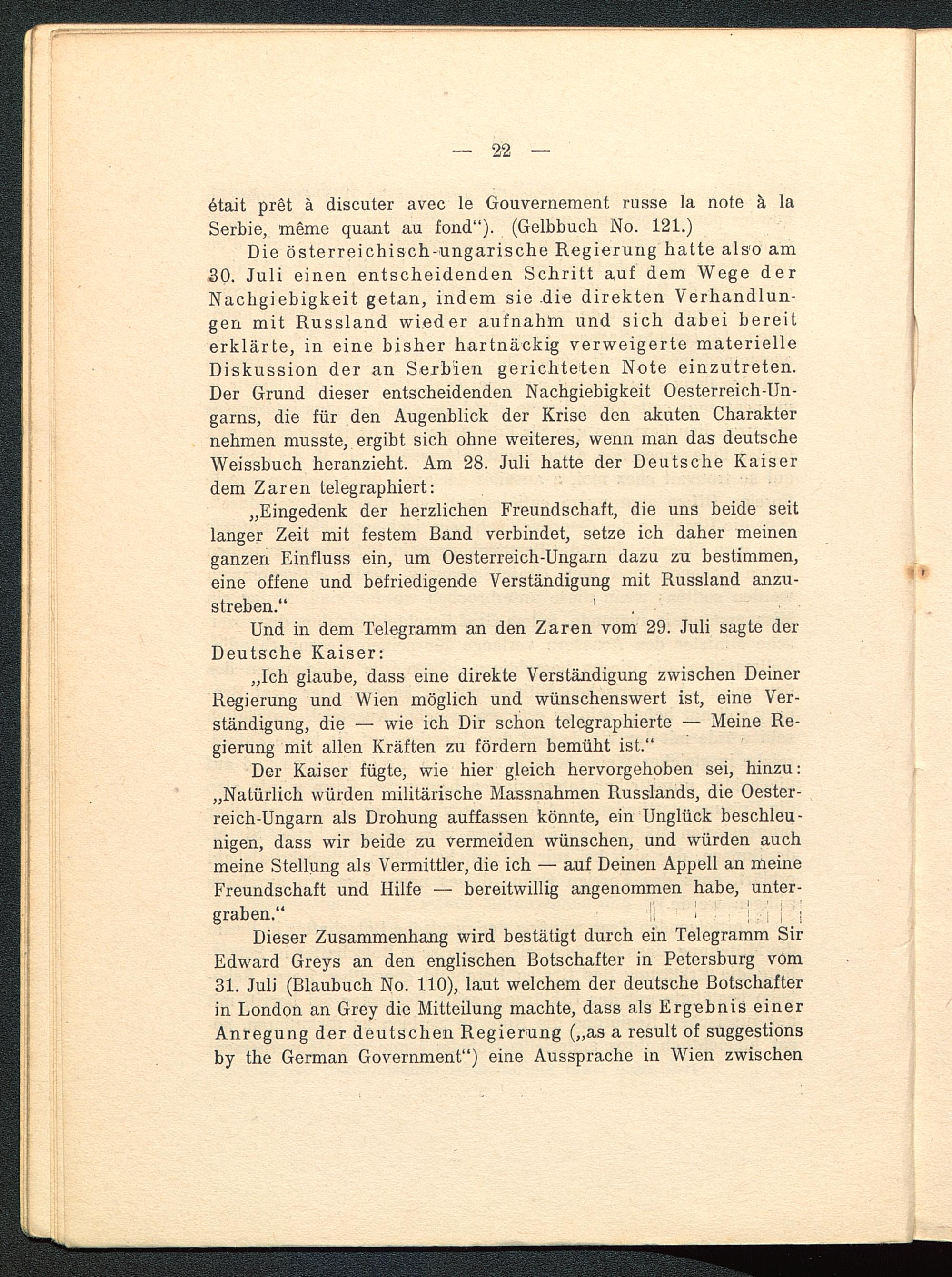 31. Juli (Blaubuch No. 110), laut welchem der deutsche Botschafterin London an Grey die Mitteilung machte, dass als Ergebnis einerAnregung der deutschen Regierung („as a result of suggestionsby the German Government") eine Aussprache in Wien zwischen