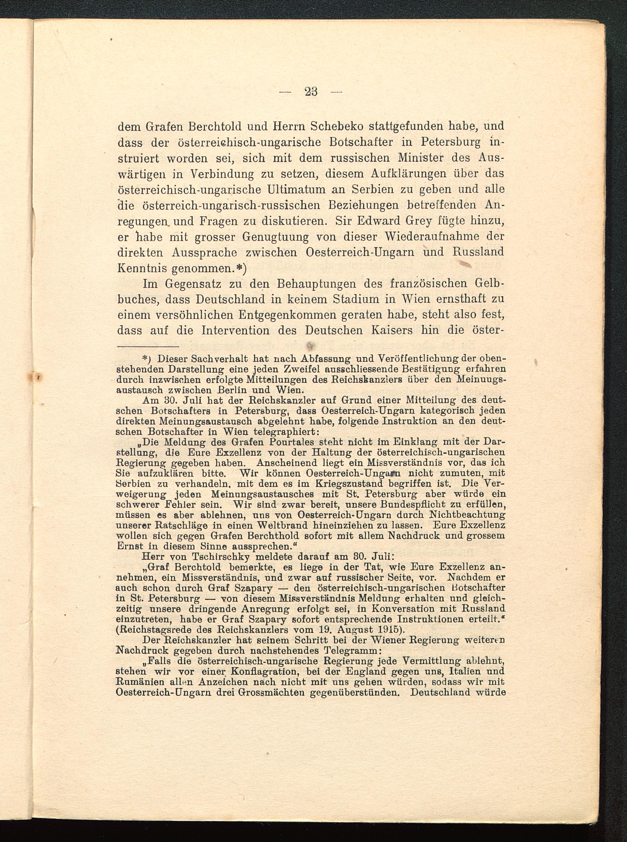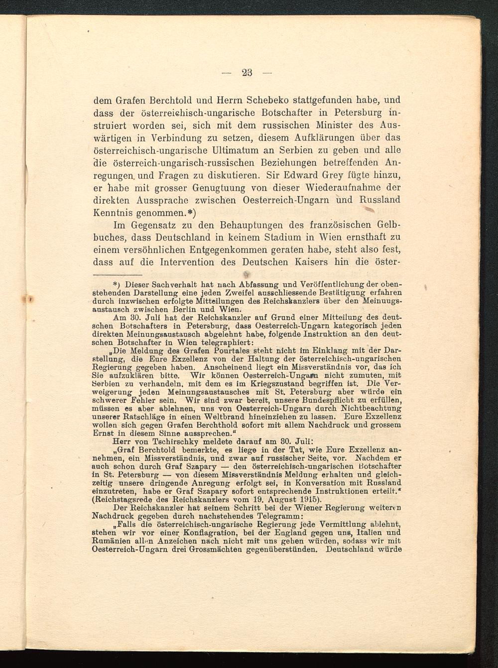 „Graf Berchtold bemerkte, es liege in der Tat, wie Eure Exzellenz an-nehmen, ein Missverständnis, und zwar auf russischer Seite, vor. Nachdem erauch schon durch Graf Szapary — den österreichisch-ungarischen Botschafterin St. Petersburg — von diesem Missverständnis Meldung erhalten und gleich-zeitig unsere dringende Anregung erfolgt sei, in Konversation mit Russland einzutreten, habe er Graf Szapary sofort entsprechende Instruktionen erteilt.*(Reichstagsrede des Reichskanzlers vom 19. August 1915).