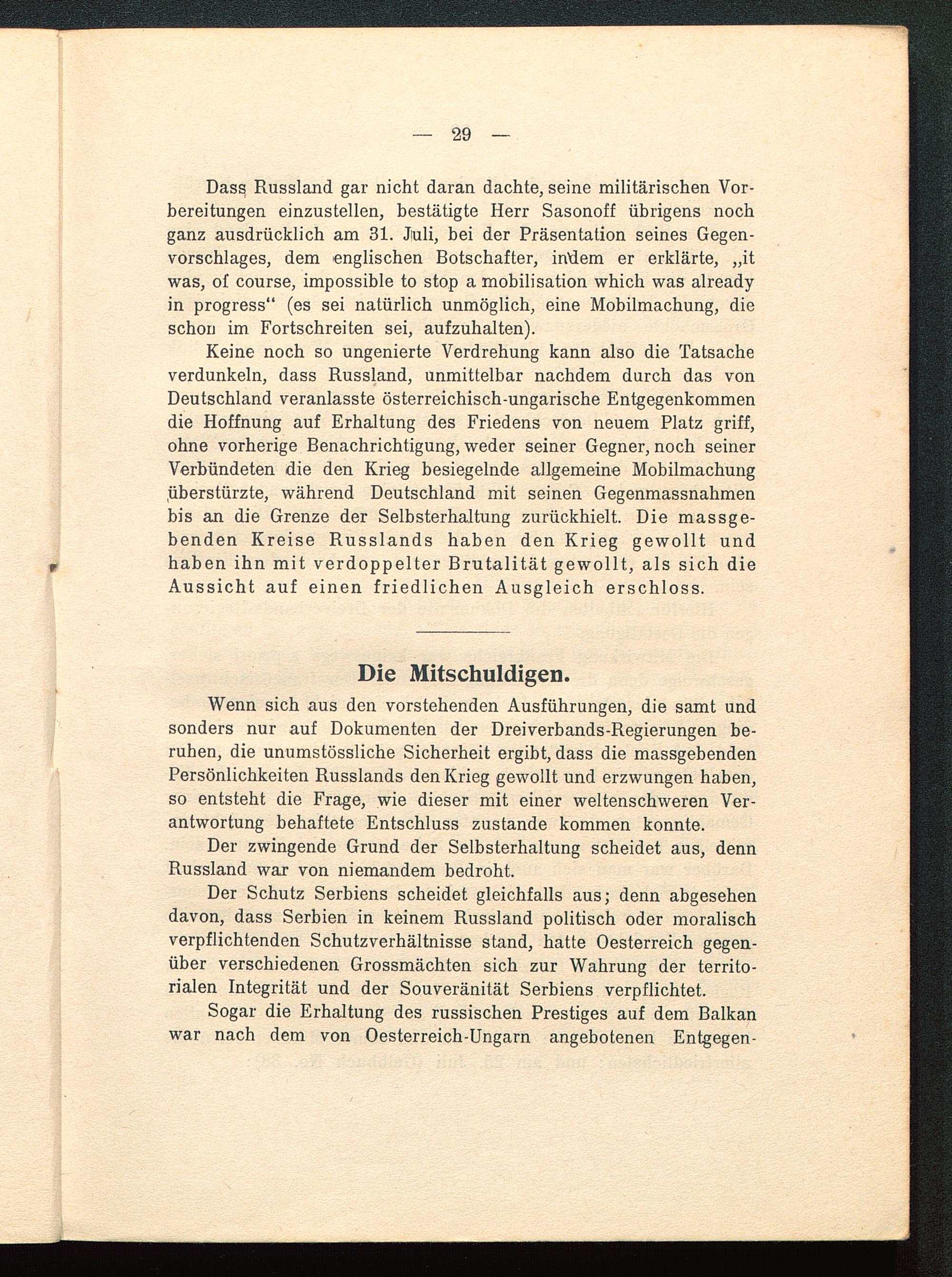 Keine noch so ungenierte Verdrehung kann also die Tatsacheverdunkeln, dass Russland , unmittelbar nachdem durch das vonDeutschland veranlasste österreichisch-ungarische Entgegenkommendie Hoffnung auf Erhaltung des Friedens von neuem Platz griff,ohne vorherige Benachrichtigung, weder seiner Gegner, noch seinerVerbündeten die den Krieg besiegelnde allgemeine MobilmachungÜberstürzte, während Deutschland mit seinen Gegenmassnahmenbis an die Grenze der Selbsterhaltung zurückhielt. Die massge-benden Kreise Russlands haben den Krieg gewollt undhaben ihn mit verdoppelter Brutalität gewollt, als sich dieAussicht auf einen friedlichen Ausgleich erschloss.