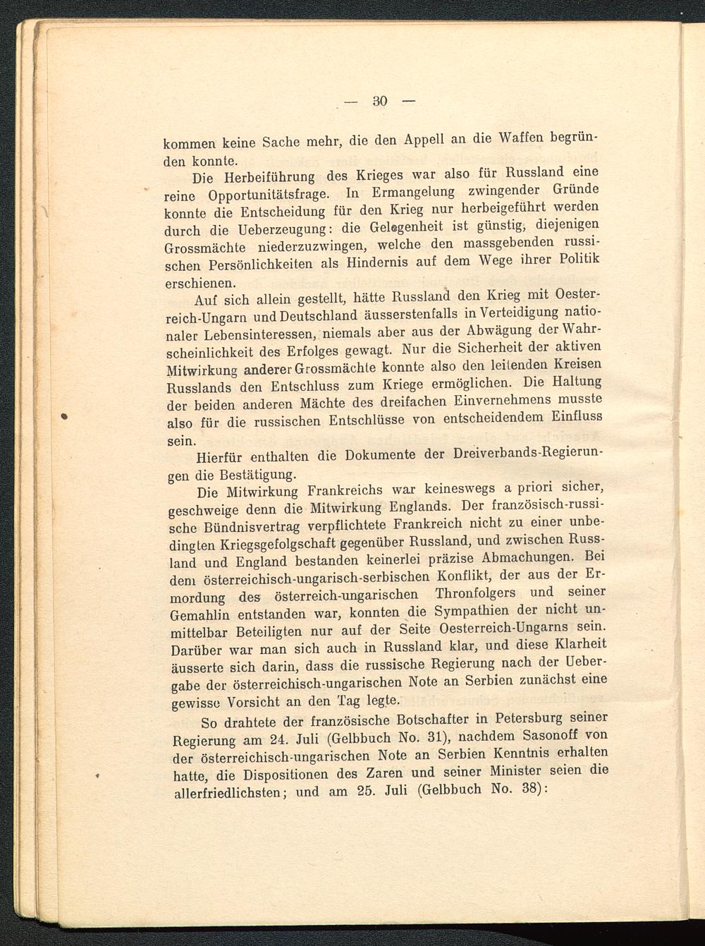 Auf sich allein gestellt, hätte Russland den Krieg mit Oester-reich-Ungarn und Deutschland äusserstenfalls in Verteidigung natio-naler Lebensinteressen, niemals aber aus der Abwägung der Wahr-scheinlichkeit des Erfolges gewagt. Nur die Sicherheit der aktivenMitwirkung anderer Grossmächte konnte also den leitenden KreisenRusslands den Entschluss zum Kriege ermöglichen. Die Haltungder beiden anderen Mächte des dreifachen Einvernehmens musstealso für die russischen Entschlüsse von entscheidendem Einflusssein.