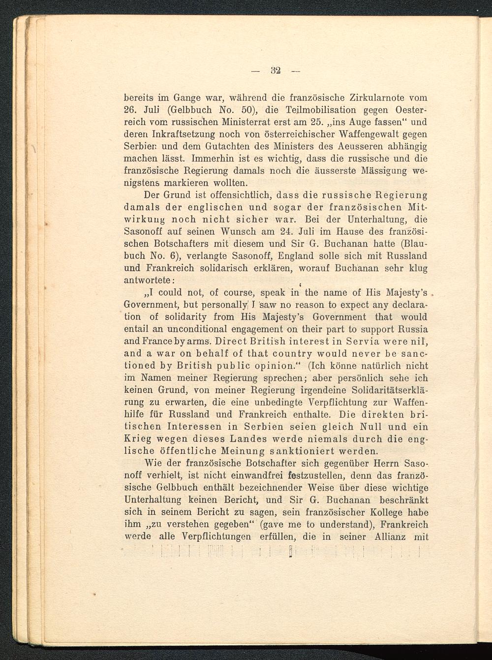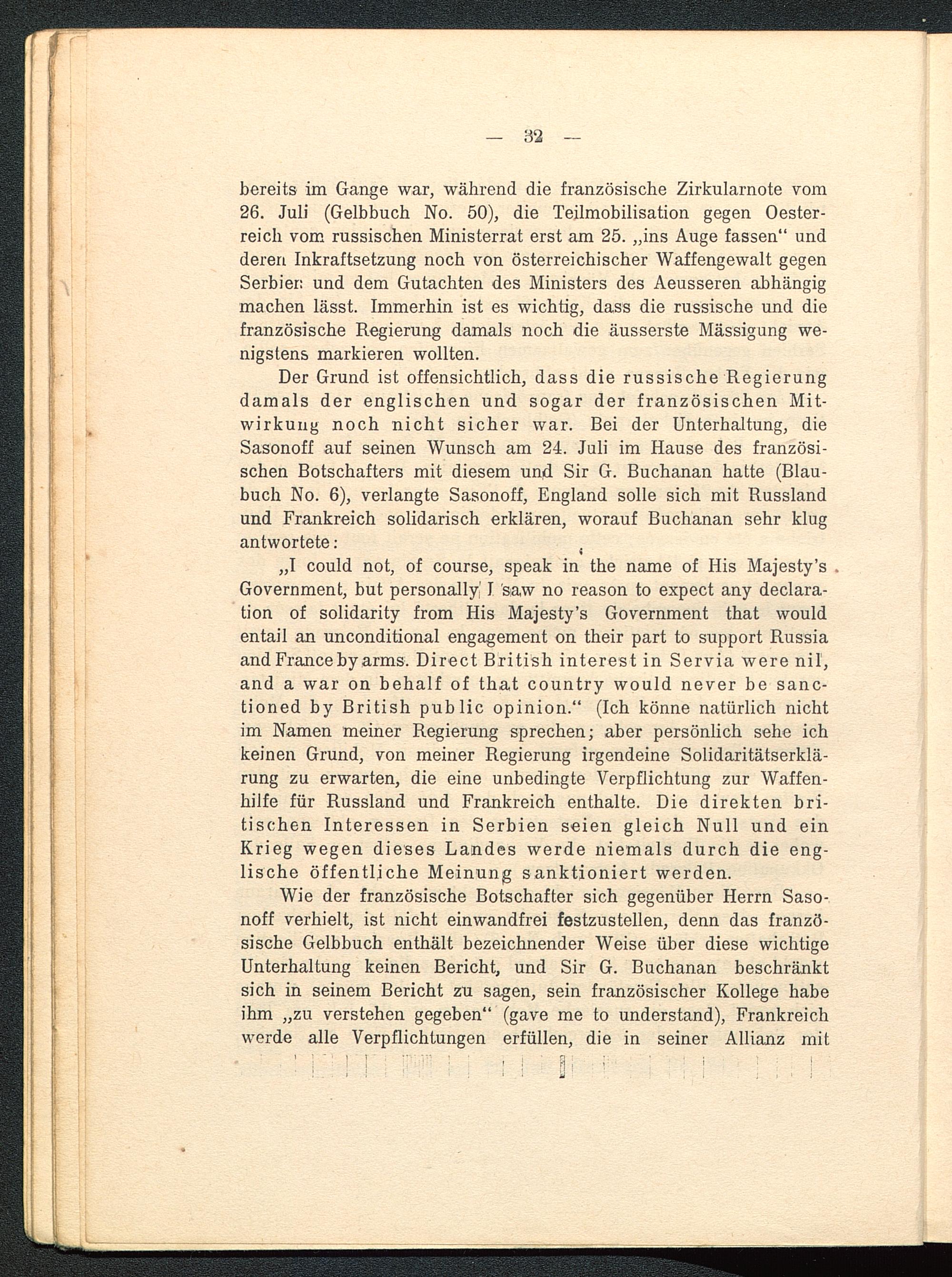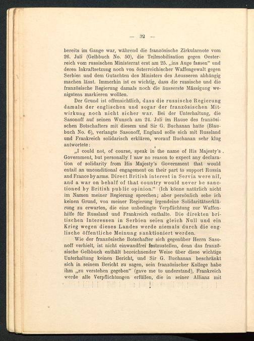 Der Grund ist offensichtlich, dass die russische Regierungdamals der englischen und sogar der französischen Mit-wirkung noch nicht sicher war. Bei der Unterhaltung, dieSasonoff auf seinen Wunsch am 24. Juli im Hause des französi-schen Botschafters mit diesem und Sir G. Buchanan hatte (Blau-buch No. 6), verlangte Sasonoff, England solle sich mit Russland und Frankreich solidarisch erklären, worauf Buchanan sehr klugantwortete: