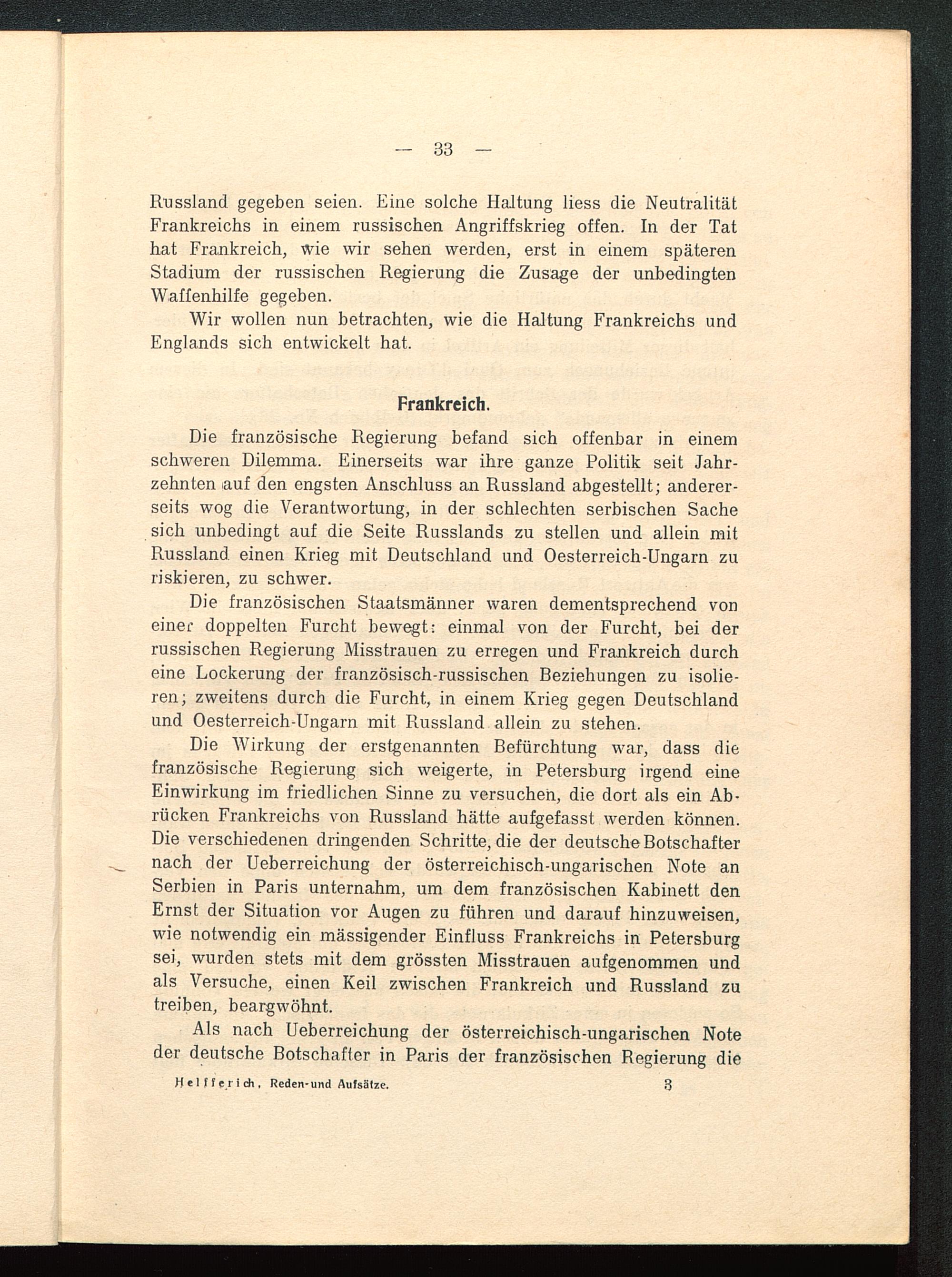 Die französische Regierung befand sich offenbar in einemschweren Dilemma. Einerseits war ihre ganze Politik seit Jahr-zehnten auf den engsten Anschluss an Russland abgestellt; anderer-seits wog die Verantwortung, in der schlechten serbischen Sachesich unbedingt auf die Seite Russlands zu stellen und allein mitRussland einen Krieg mit Deutschland und Oesterreich-Ungarn zuriskieren, zu schwer.