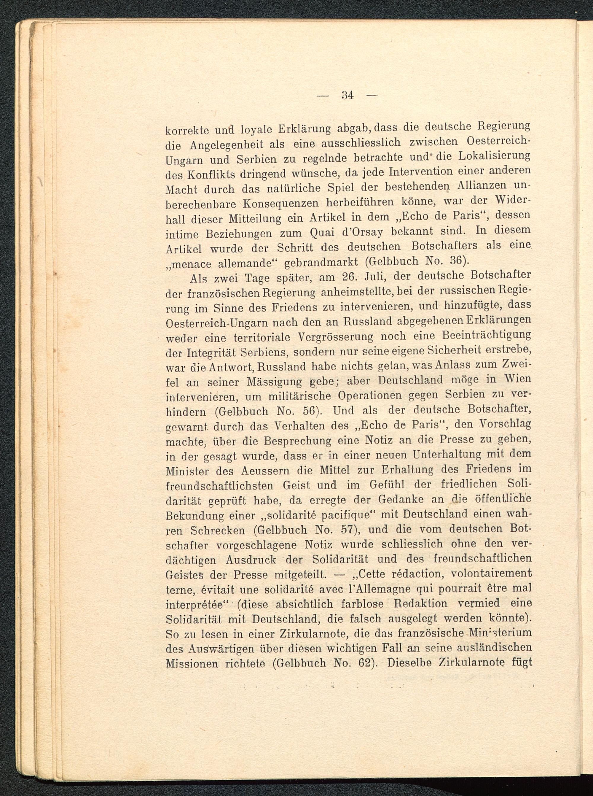 Als zwei Tage später, am 26. Juli, der deutsche Botschafterder französischen Regierung anheimstellte, bei der russischen Regie-rung im Sinne des Friedens zu intervenieren, und hinzufügte, dassOesterreich-Ungarn nach den an Russland abgegebenen Erklärungenweder eine territoriale Vergrösserung noch eine Beeinträchtigungder Integrität Serbiens , sondern nur seine eigene Sicherheit erstrebe,war die Antwort, Russland habe nichts getan, was Anlass zum Zwei-fel an seiner Mässigung gebe; aber Deutschland möge in Wien intervenieren, um militärische Operationen gegen Serbien zu ver-hindern (Gelbbuch No. 56). Und als der deutsche Botschafter,gewarnt durch das Verhalten des „Echo de Paris", den Vorschlagmachte, über die Besprechung eine Notiz an die Presse zu geben,in der gesagt wurde, dass er in einer neuen Unterhaltung mit demMinister des Aeussern die Mittel zur Erhaltung des Friedens imfreundschaftlichsten Geist und im Gefühl der friedlichen Soli-darität geprüft habe, da erregte der Gedanke an die öffentlicheBekundung einer „solidarite pacifique" mit Deutschland einen wah-ren Schrecken (Gelbbuch No. 57), und die vom deutschen Bot-schafter vorgeschlagene Notiz wurde schliesslich ohne den ver-dächtigen Ausdruck der Solidarität und des freundschaftlichenGeistes der Presse mitgeteilt. — „Cette redaction, volontairementterne, evitait une solidarite avec TAllemagne qui pourrait etre malinterpretee" (diese absichtlich farblose Redaktion vermied eineSolidarität mit Deutschland , die falsch ausgelegt werden könnte).So zu lesen in einer Zirkularnote, die das französische Ministeriumdes Auswärtigen über diesen wichtigen Fall an seine ausländischenMissionen richtete (Gelbbuch No. 62). Dieselbe Zirkularnote fügt