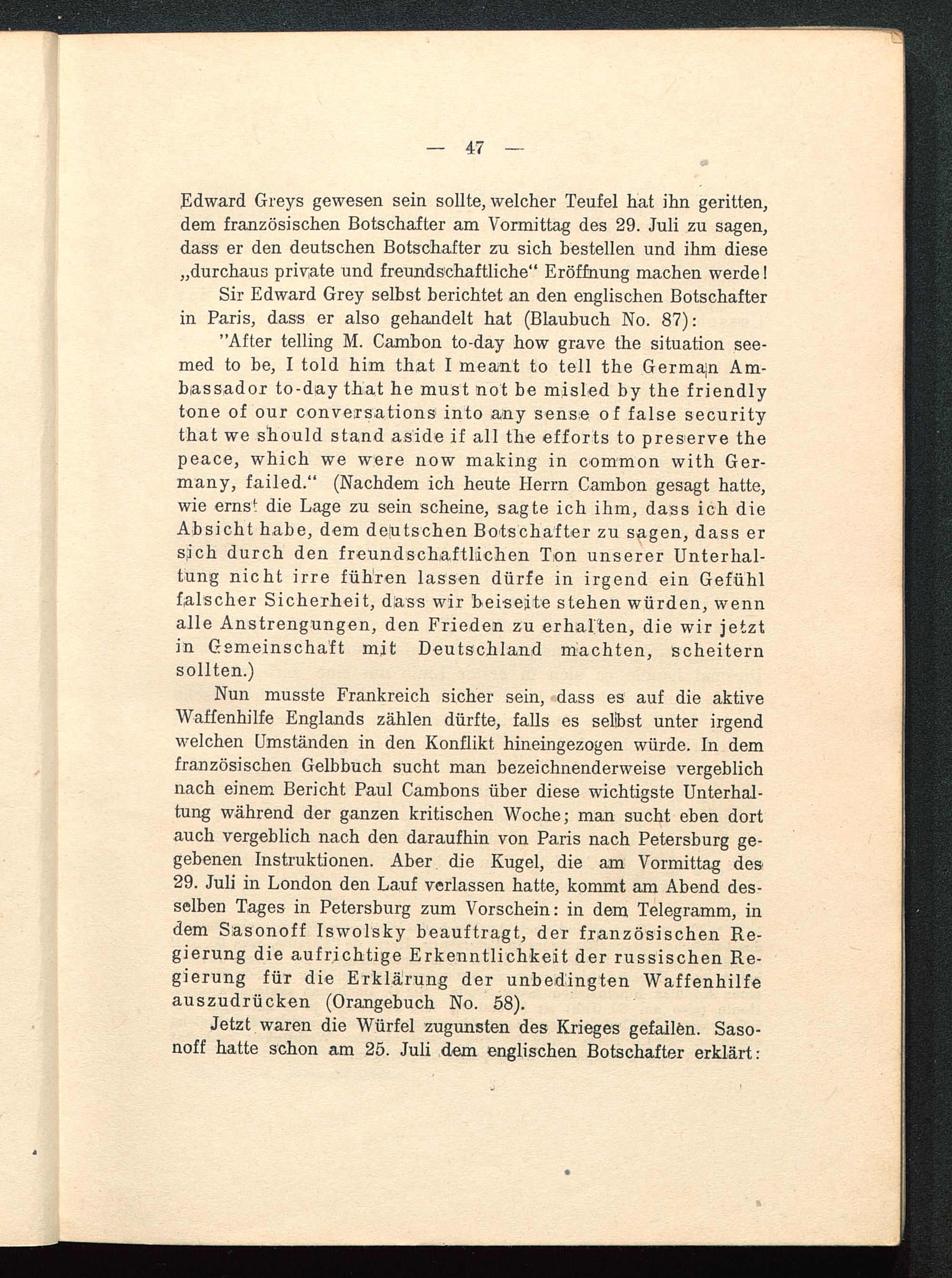 Nun musste Frankreich sicher sein, dass es auf die aktiveWaffenhilfe Englands zählen dürfte, falls es selbst unter irgendwelchen Umständen in den Konflikt hineingezogen würde. In demfranzösischen Gelbbuch sucht man bezeichnenderweise vergeblichnach einem Bericht Paul Cambons über diese wichtigste Unterhal-tung während der ganzen kritischen Woche; man sucht eben dortauch vergeblich nach den daraufhin von Paris nach Petersburg ge-gebenen Instruktionen. Aber die Kugel, die am Vormittag des29. Juli in London den Lauf verlassen hatte, kommt am Abend des-selben Tages in Petersburg zum Vorschein: in dem Telegramm, indem Sasonoff Iswolsky beauftragt, der französischen Re-gierung die aufrichtige Erkenntlichkeit der russischen Re-gierung für die Erklärung der unbedingten Waffenhilfeauszudrücken (Orangebuch No. 58).