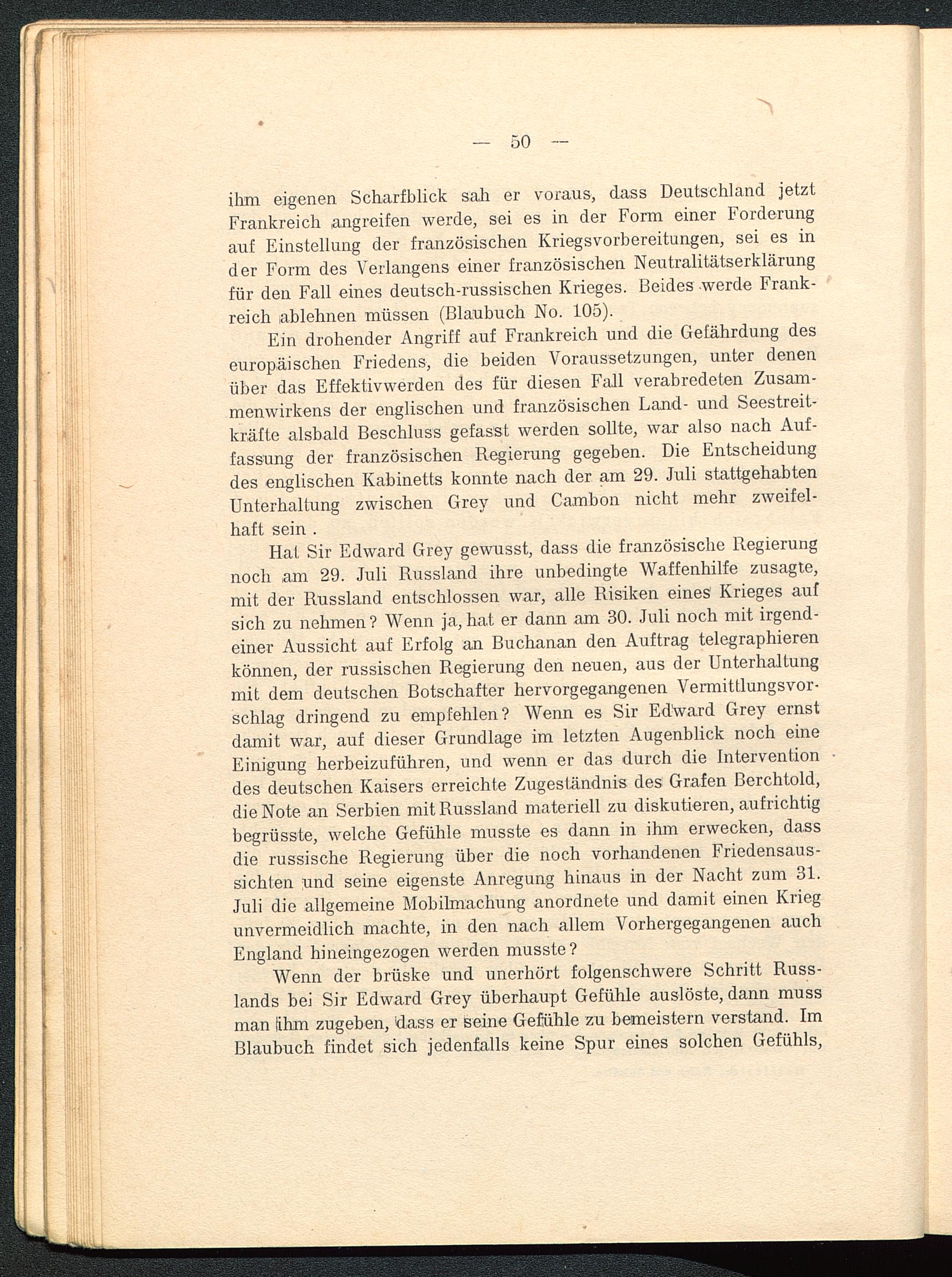 AVenn der brüske und unerhört folgenschwere Schritt Russ-lands bei Sir Edward Grey überhaupt Gefühle auslöste, dann mussman (ihm zugeben, dass er seine Gefühle zu bemeistern verstand. ImBlaubuch findet sich jedenfalls keine Spur eines solchen Gefühls,