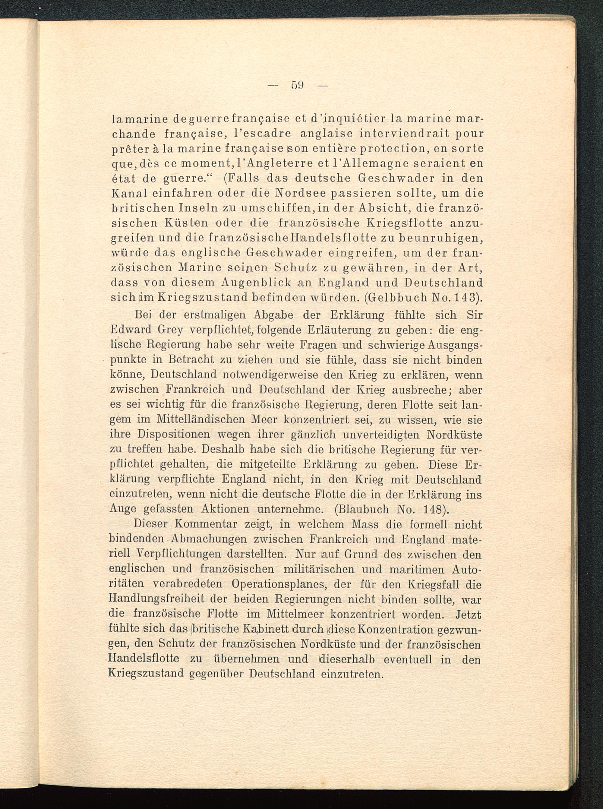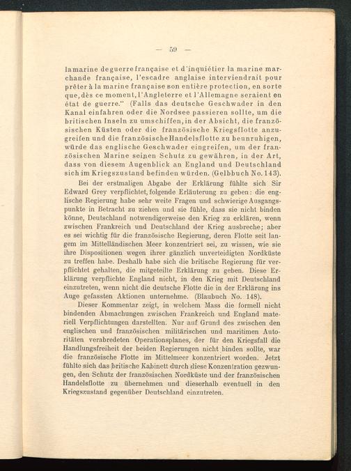 lamarine deguerrefrancaise et d'inquietier la marine mar-chande francaise, l'escadre anglaise interviendrait pourpreter ä la marine francaise son entiere protection, en sorteque,des ce moment,l'Angleterre et l'Allemagne seraient enetat de guerre." (Falls das deutsche Geschwader in denKanal einfahren oder die Nordsee passieren sollte, um diebritischen Inseln zu umschiffen,in der Absicht, die franzö-sischen Küsten oder die französische Kriegsflotte anzu-greifen und die französischeHandelsflotte zu beunruhigen,würde das englische Geschwader eingreifen, um der fran-zösischen Marine seinen Schutz zu gewähren, in der Art,dass von diesem Augenblick an England und Deutschland sich im Kriegszustand befinden würden. (Gelbbuch No. 143).