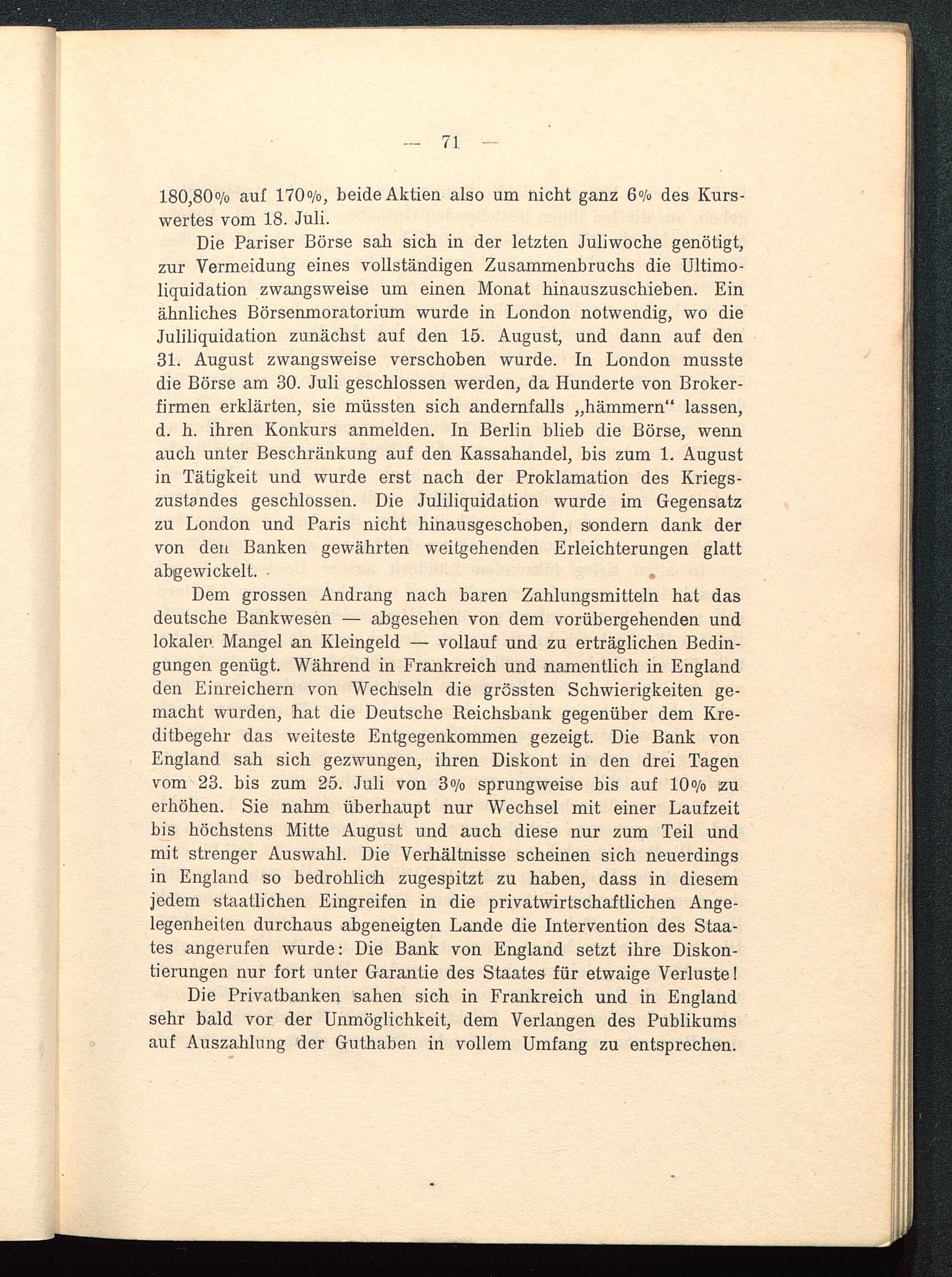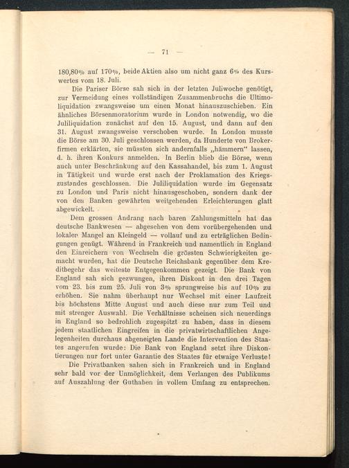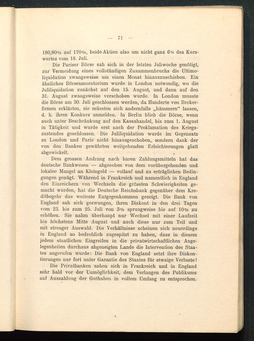 Die Pariser Börse sali sich in der letzten Juliwoche genötigt,zur Vermeidung eines vollständigen Zusammenbruchs die Ultimo-liquidation zwangsweise um einen Monat hinauszuschieben. Einähnliches Börsenmoratorium wurde in London notwendig, wo dieJuliliquidation zunächst auf den 15. August, und dann auf den31. August zwangsweise verschoben wurde. In London musstedie Börse am 30. Juli geschlossen werden, da Hunderte von Broker-firmen erklärten, sie müssten sich andernfalls „hämmern" lassen,d. h. ihren Konkurs anmelden. In Berlin blieb die Börse, wennauch unter Beschränkung auf den Kassahandel, bis zum 1. Augustin Tätigkeit und wurde erst nach der Proklamation des Kriegs-zustandes geschlossen. Die Juliliquidation wurde im Gegensatzzu London und Paris nicht hinausgeschoben, sondern dank dervon den Banken gewährten weitgehenden Erleichterungen glattabgewickelt. • .