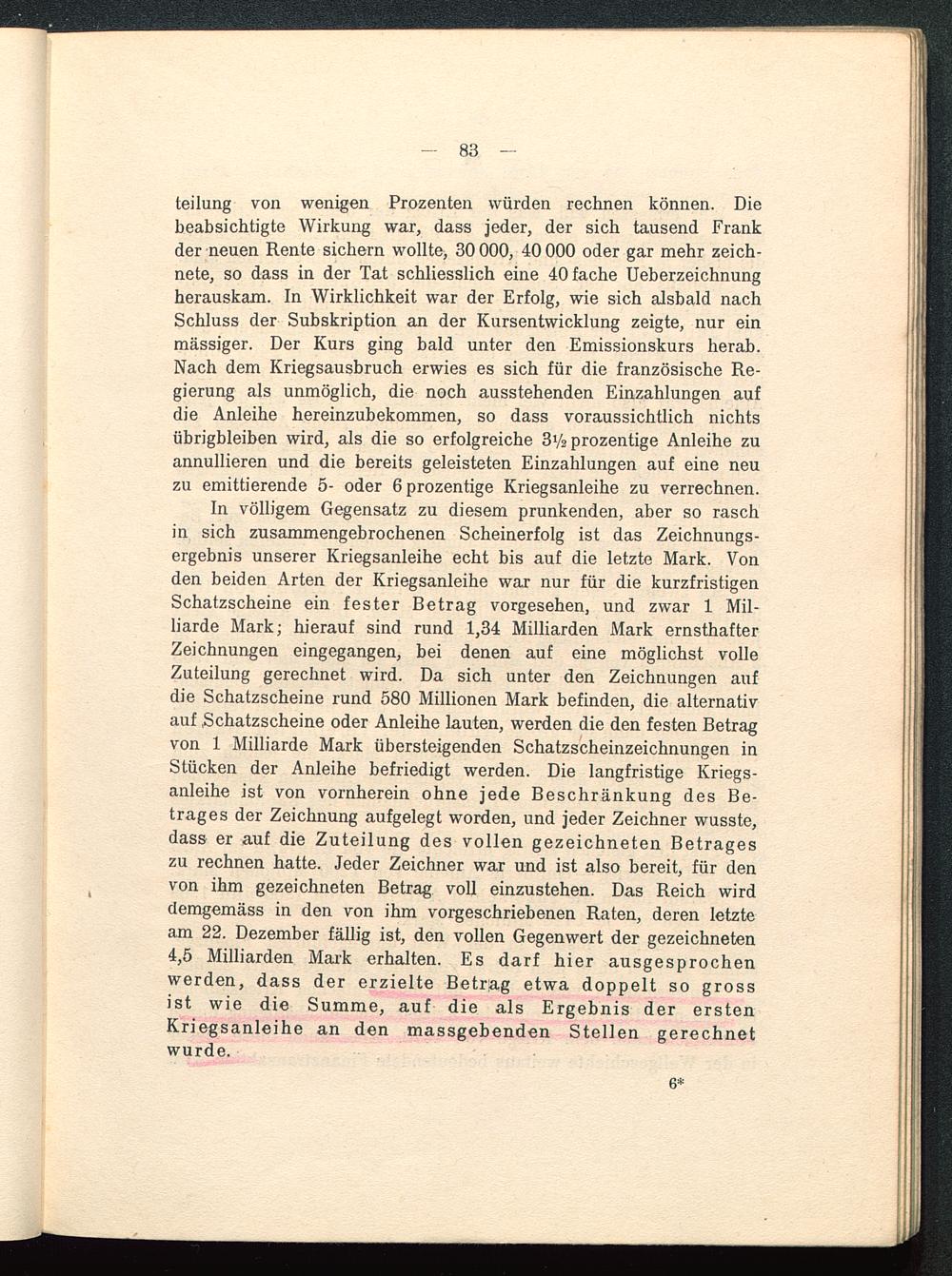 teilung von wenigen Prozenten würden rechnen können. Diebeabsichtigte Wirkung war, dass jeder, der sich tausend Frankder neuen Rente sichern wollte, 30000, 40 000 oder gar mehr zeich-nete, so dass in der Tat schliesslich eine 40 fache Ueberzeichnungherauskam. In Wirklichkeit war der Erfolg, wie sich alsbald nachSchluss der Subskription an der Kursentwicklung zeigte, nur einmassiger. Der Kurs ging bald unter den Emissionskurs herab.Nach dem Kriegsausbruch erwies es sich für die französische Re-gierung als unmöglich, die noch ausstehenden Einzahlungen aufdie Anleihe hereinzubekommen, so dass voraussichtlich nichtsübrigbleiben wird, als die so erfolgreiche 3y 2 prozentige Anleihe zuannullieren und die bereits geleisteten Einzahlungen auf eine neuzu emittierende 5- oder 6 prozentige Kriegsanleihe zu verrechnen.