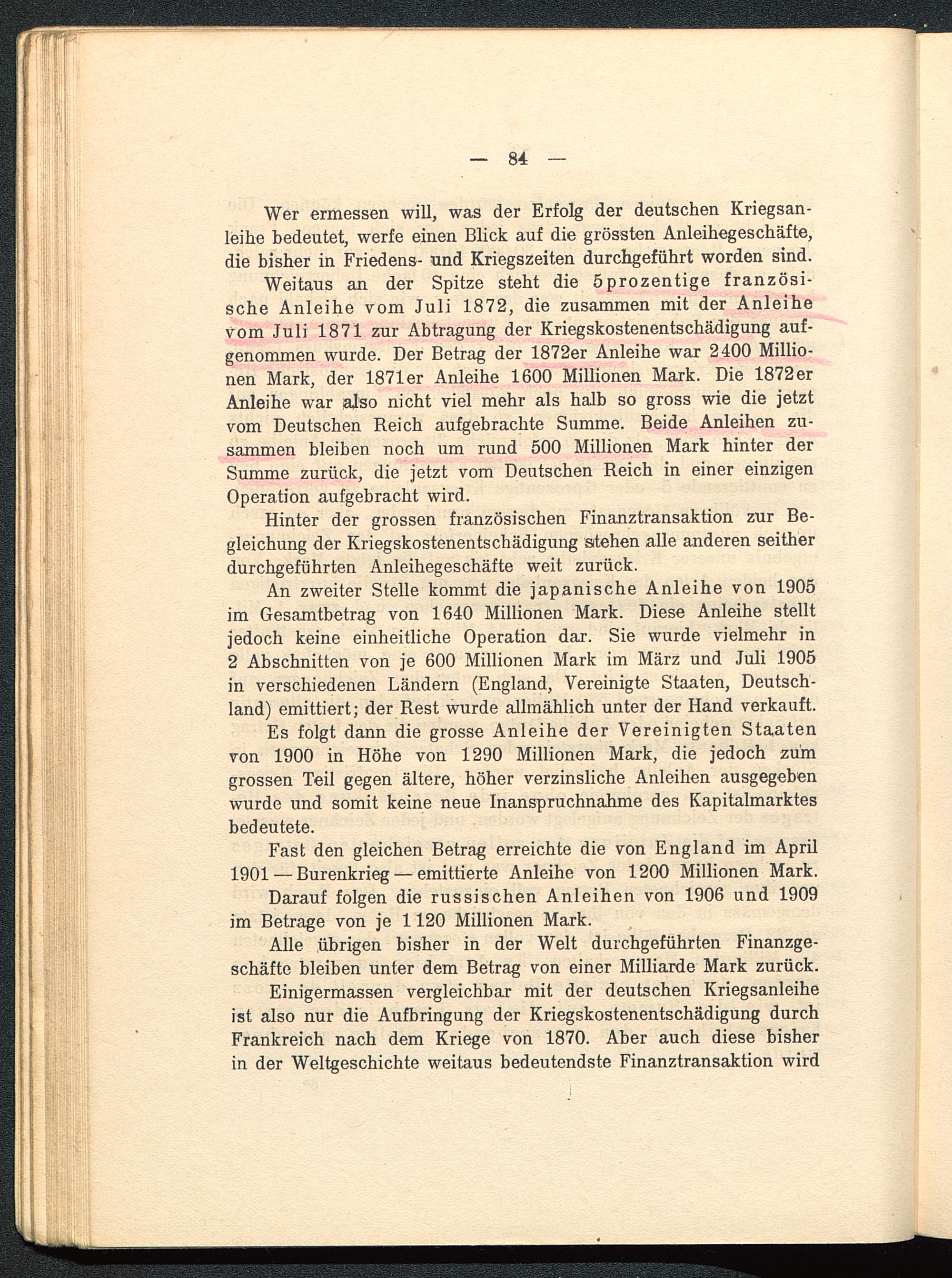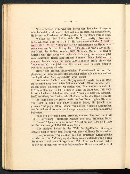 Einigermassen vergleichbar mit der deutschen Kriegsanleiheist also nur die Aufbringung der Kriegskostenentschädigung durchFrankreich nach dem Kriege von 1870. Aber auch diese bisherin der Weltgeschichte weitaus bedeutendste Finanztransaktion wird