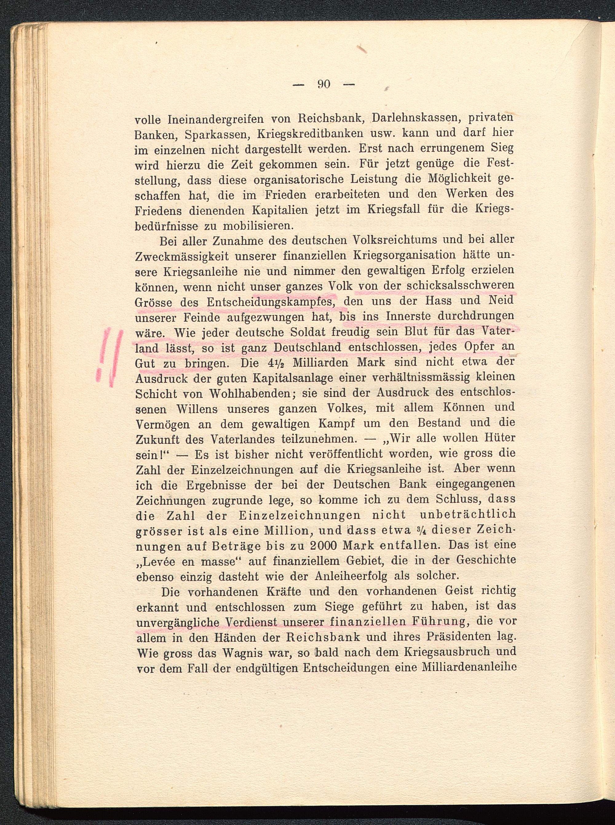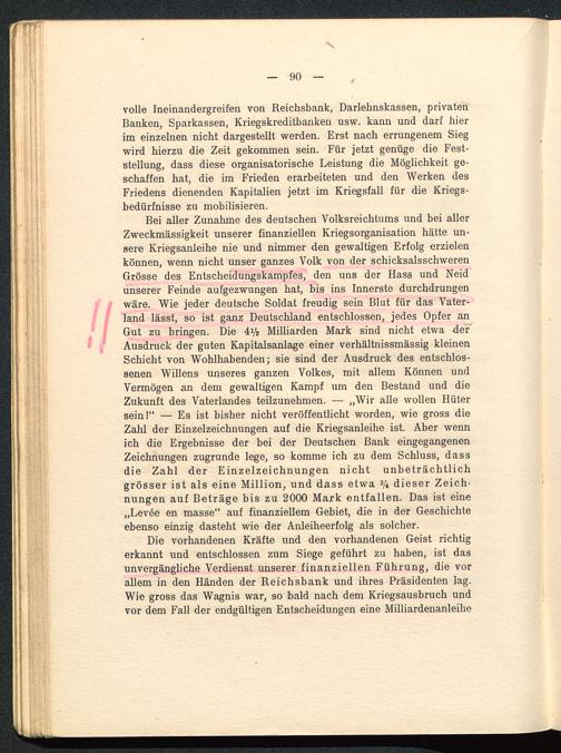 Die vorhandenen Kräfte und den vorhandenen Geist richtigerkannt und entschlossen zum Siege geführt zu haben, ist dasunvergängliche Verdienst unserer finanziellen Führung, die vorallem in den Händen der Reichsbank und ihres Präsidenten lag.Wie gross das Wagnis war, so bald nach dem Kriegsausbruch undvor dem Fall der endgültigen Entscheidungen eine Milliardenanleihe