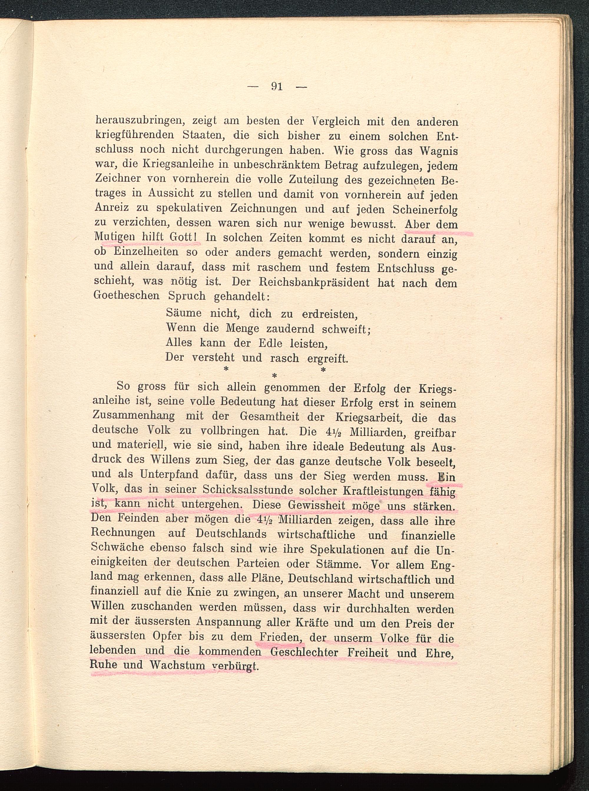So gross für sich allein genommen der Erfolg der Kriegs-anleihe ist, seine volle Bedeutung hat dieser Erfolg erst in seinemZusammenhang mit der Gesamtheit der Kriegsarbeit, die dasdeutsche Volk zu vollbringen hat. Die 4y 2 Milliarden, greifbarund materiell, wie sie sind, haben ihre ideale Bedeutung als Aus-druck des Willens zum Sieg, der das ganze deutsche Volk beseelt,und als Unterpfand dafür, dass uns der Sieg werden muss. EinVolk, das in seiner Schicksalsstunde solcher Kraftleistungen fähigist, kann nicht untergehen. Diese Gewissheit möge uns stärken.Den Feinden aber mögen die 4y 2 Milliarden zeigen, dass alle ihreRechnungen auf Deutschlands wirtschaftliche und finanzielleSchwäche ebenso falsch sind wie ihre Spekulationen auf die Un-einigkeiten der deutschen Parteien oder Stämme. Vor allem Eng-land mag erkennen, dass alle Pläne, Deutschland wirtschaftlich undfinanziell auf die Knie zu zwingen, an unserer Macht und unseremWillen zuschanden werden müssen, dass wir durchhalten werdenmit der äussersten Anspannung aller Kräfte und um den Preis deräussersten Opfer bis zu dem Frieden, der unserm Volke für dielebenden und die kommenden Geschlechter Freiheit und Ehre,Ruhe und Wachstum verbürgt.